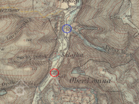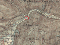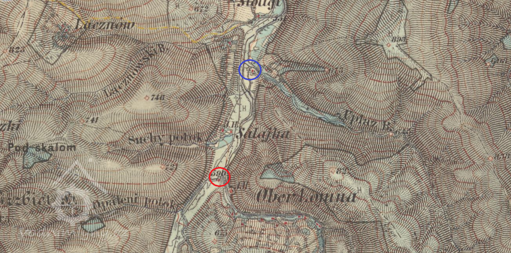 Horní (červeně) a Prostřední (modře) mlýn v Horní Lomné, III. vojenské mapování, výřez, 1876-1878, © oldmaps.geolab.cz