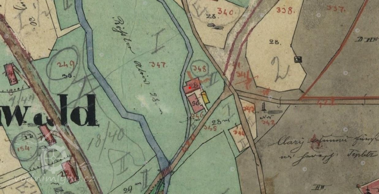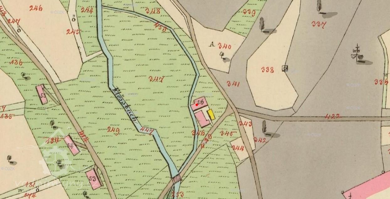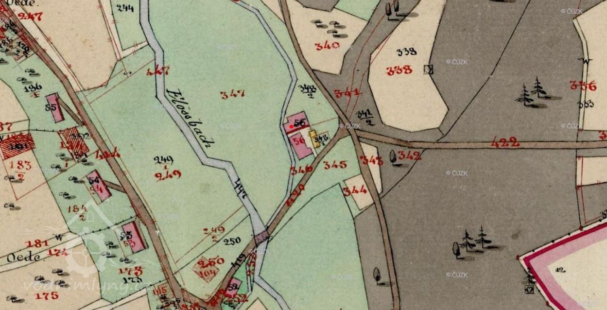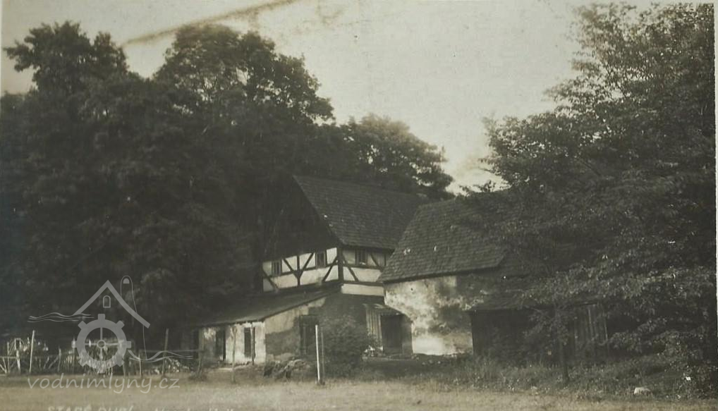 1963 - na leteckém měřičském snímku jsou z mlýna už jen obvodové zdi. Stodola ještě stojí.