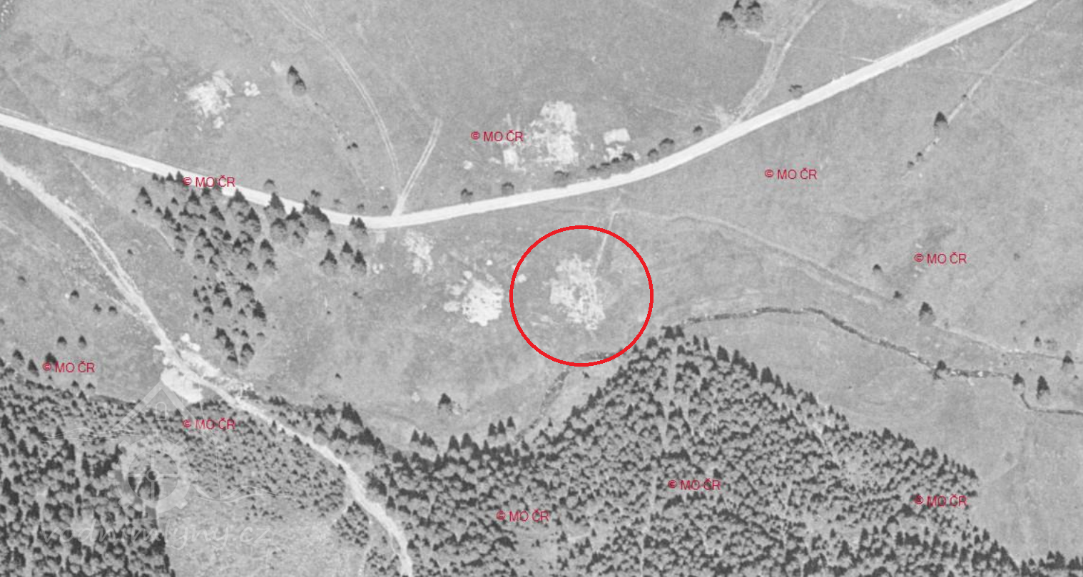 Pila s vantroky bez čp. /st.p. 257 - postavena roku 1935 (původně přibližně v tomto místě stál mlýn čp. 135/st.p. 147, někdy v letech 1837 - 43 přečíslovaný na čp. 9, zbořený v letech 1902-05), dům čp. 66/st.p. 285 - postavený roku 1936 (původně stál v tomto místě dům bez čp. na st.p. 146 - odstraněn v letech 1902-05), dům čp. 29/st.p. 145, kaple na st.p. 236 (její horní část zakrývá strom, postavena roku 1905 cca 15 metrů západně od nové usedlosti čp. 9 - zbořena byla možná ještě před r. 1950, nyní poz.č. 1461 - v r. 2017 bylo upraveno místo kaple pro její plánovanou obnovu), velká usedlost čp. 9/st.p. 222 - postavena roku 1902 (čp. 9 bylo přeneseno z býv. mlýna - v roce 1927 byla zvětšena o hospodářské přístavky).