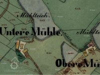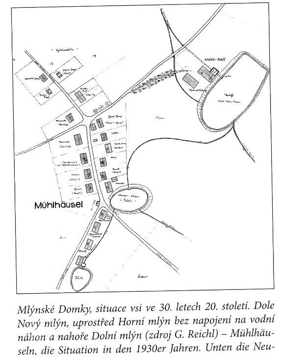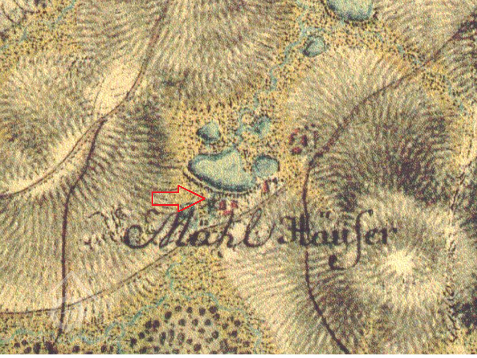 Na mapě I. vojenského mapování je zakreslena osada pod názvem Mühl Häuser s Dolním mlýnem pod hrází největšího rybníka.