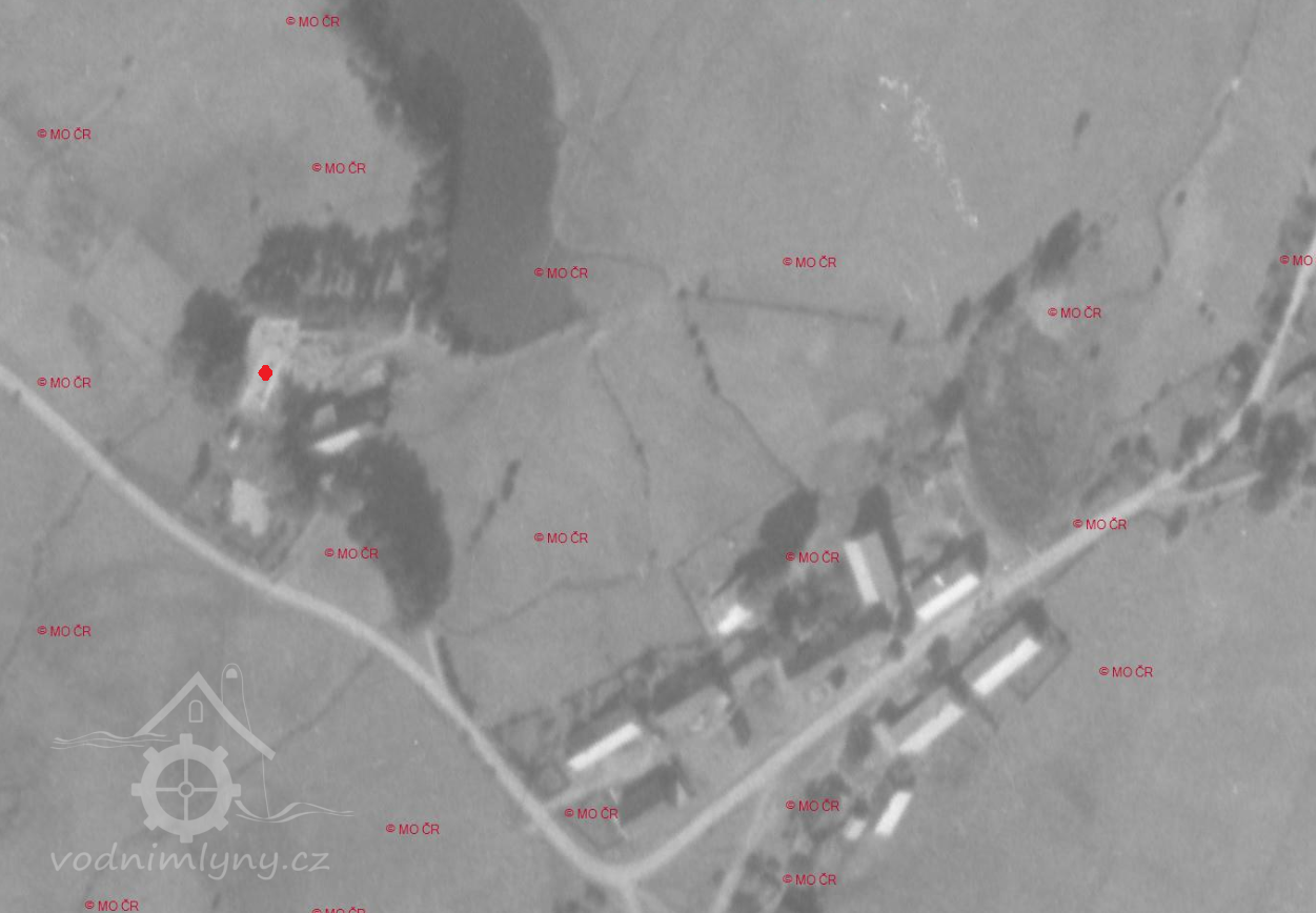 Na leteckém snímku z roku 1947 jsou budovy ještě v zachovalém stavu.