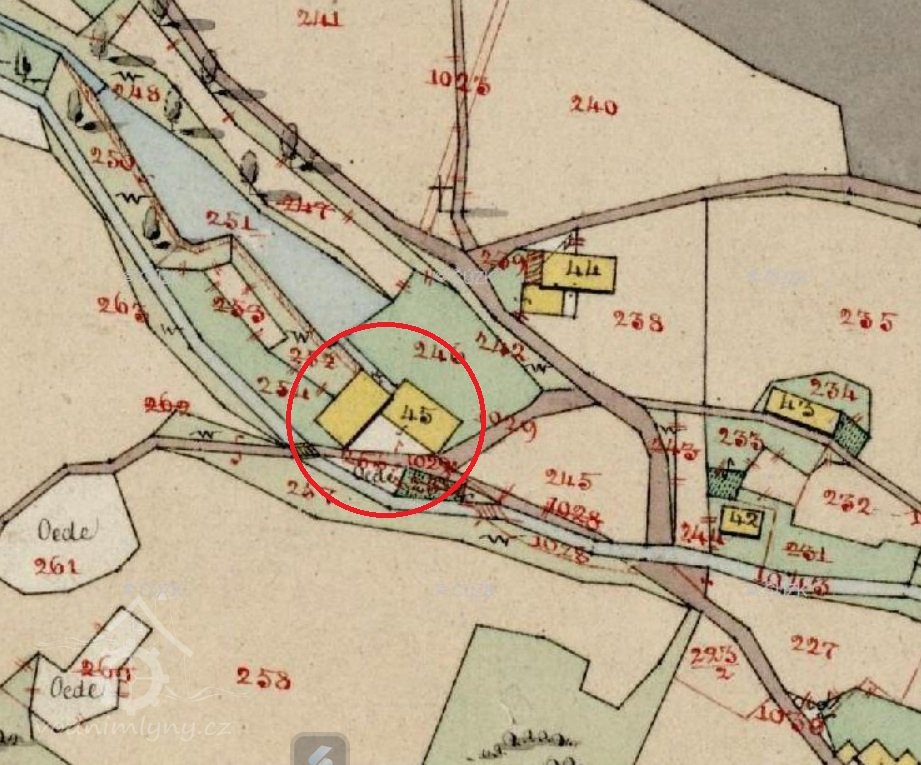 PopisV r. 1930 zde byla 2 kola na svrchní vodu, průtok 0,07 a 0,05 m3/s, spád 5 a 4,35 m, výkon 5,29 k.