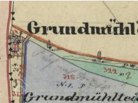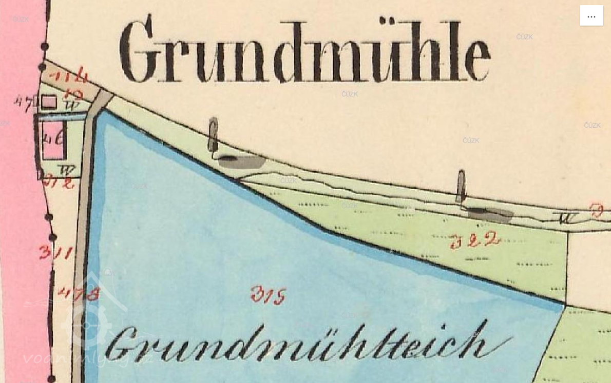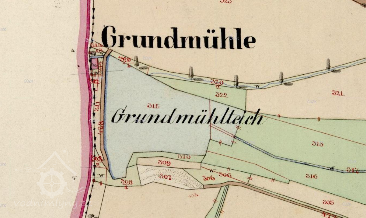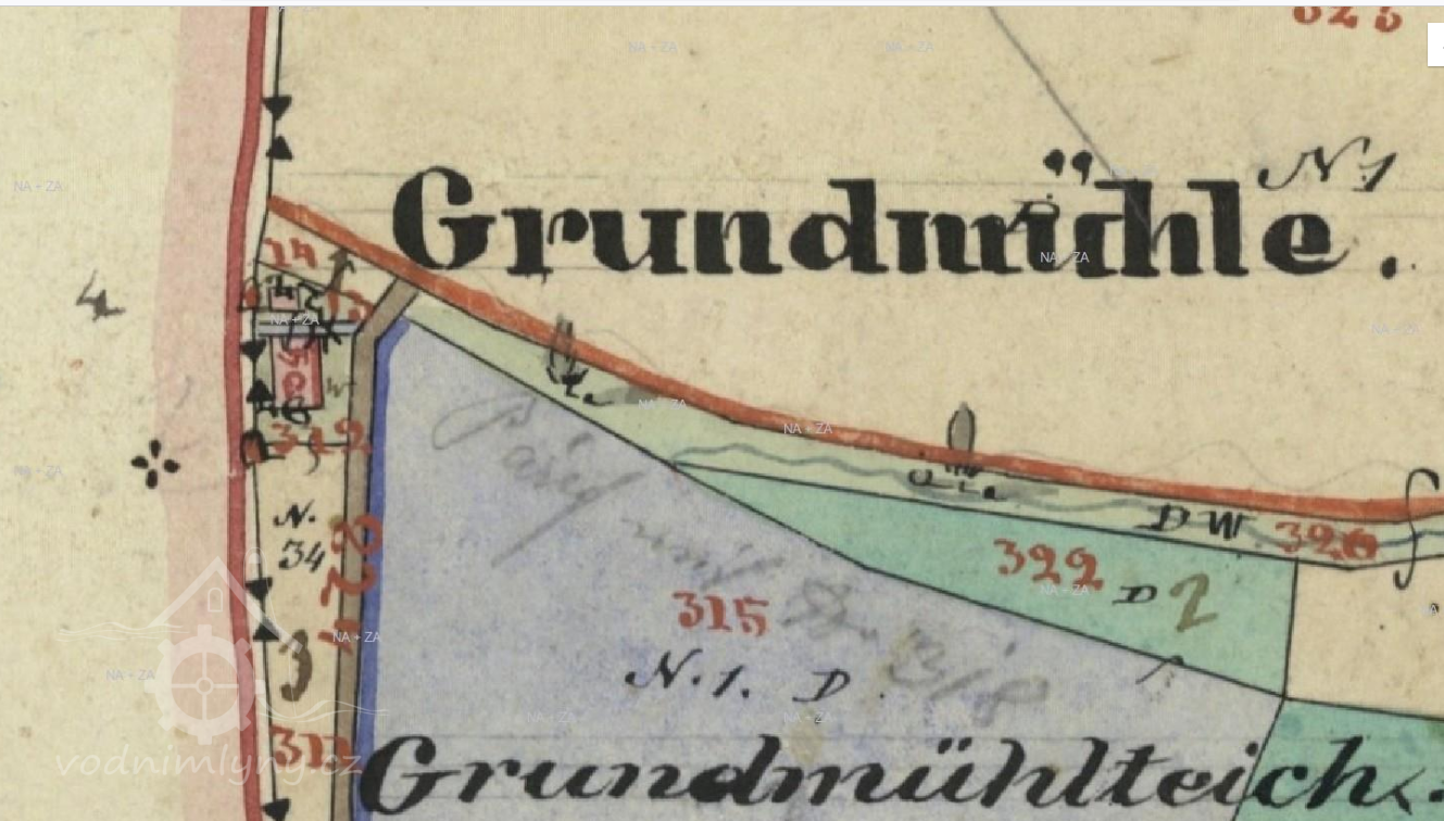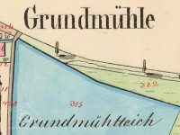 1843 - mlýn měl čp. 34. Majitel mlýna není na indikační skice uveden. Mlýnský rybník - Grundmühlteich patřil hraběti Heinrichu (Jindřichu) Chotkovi.
