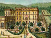 Již v roce 1837 je uváděn Lesní mlýn (Muhlen- Wirthaus) s kuželkářskou dráhou jako oblíbený cíl vycházek a to také díky bezprostřednímu sousedství Lesního pramene. Oficiální provoz hostince a kavárny je však uváděn až za vlastnictví rodiny Dietlů v 50.letech 19.století. Vznik hotelu v roce 1877 je taktéž zánikem mlýnského provozu . Pod vedením Josefa Hanslíka ze Žatce (zetě Dietlů) se stává z Lesního mlýna velice oblíbená kavárna s restaurací.