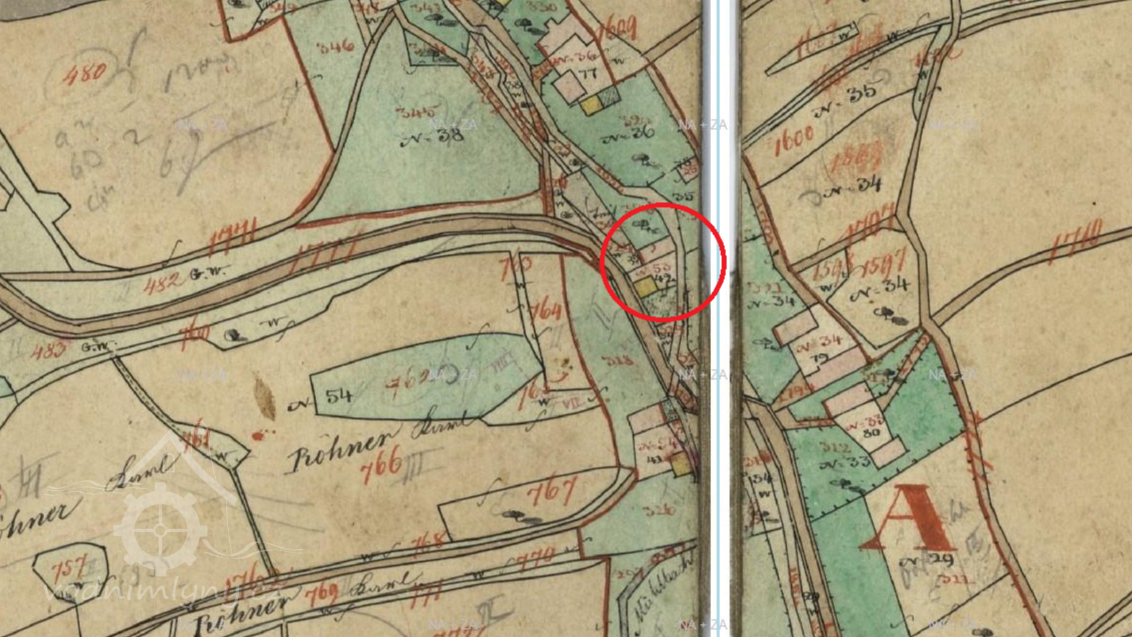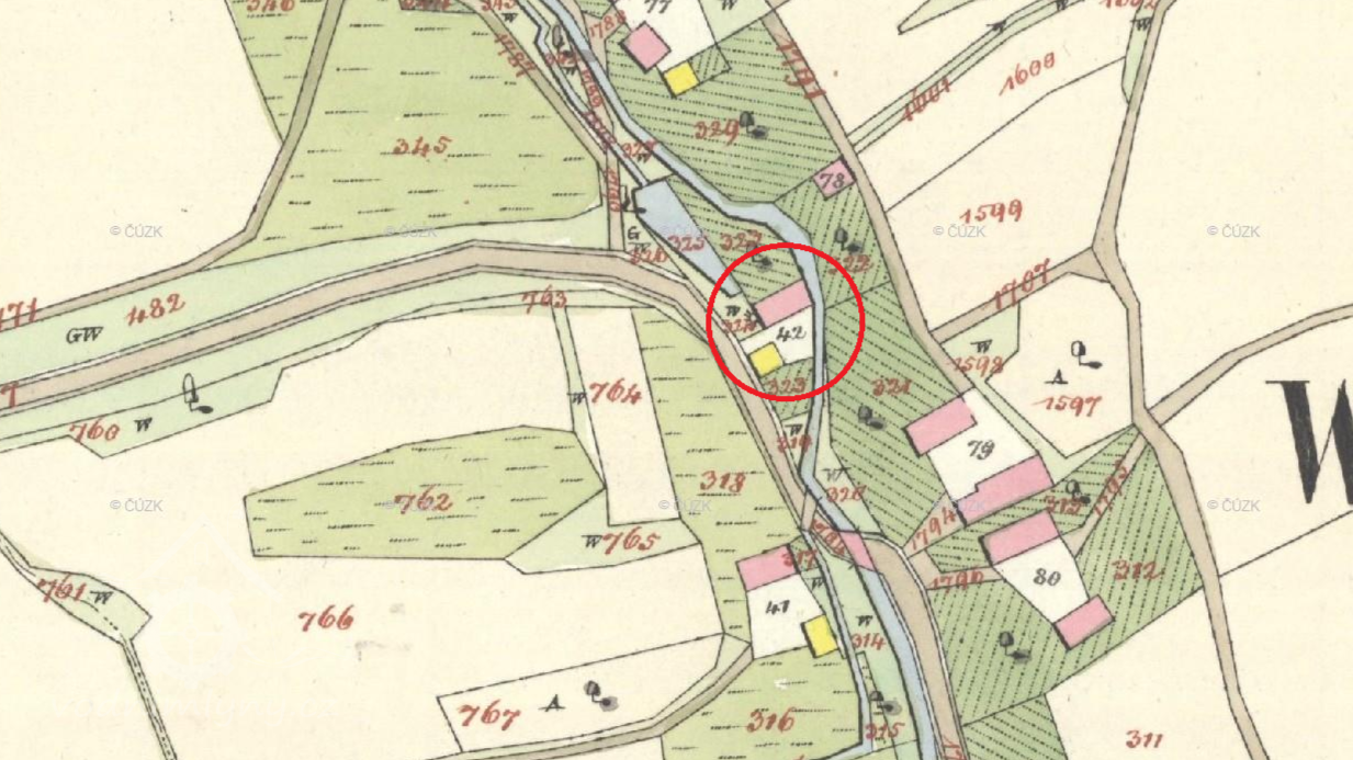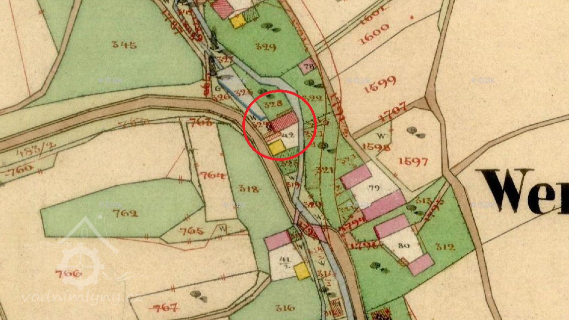 Zaniklý mlýn. Nacházel se v místě, kde se od hlavní cesty oddělovala cesta do Louchova.