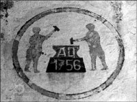 vápenné, zčásti už odprýskané omítce namalován (al secco) v kruhu motiv dvou kovářů u kovadliny