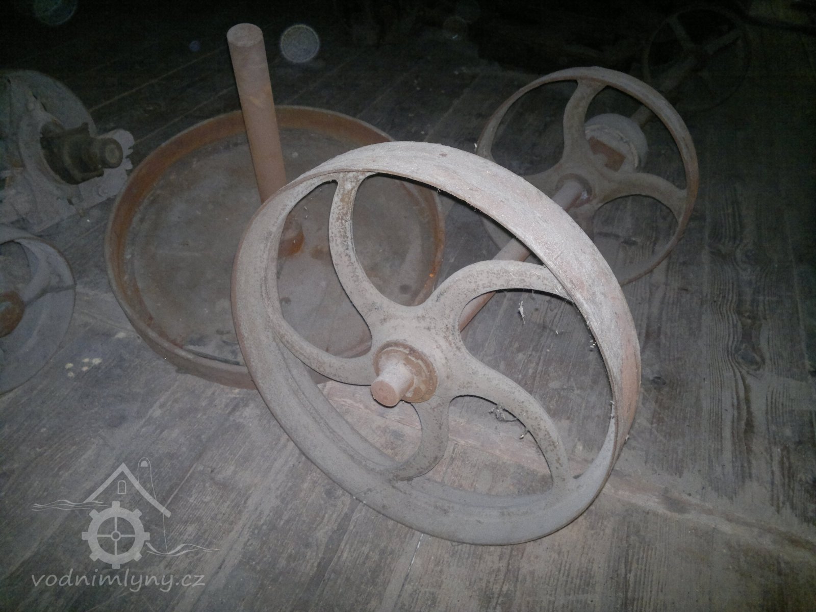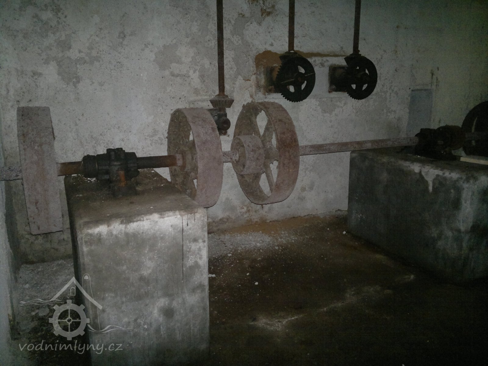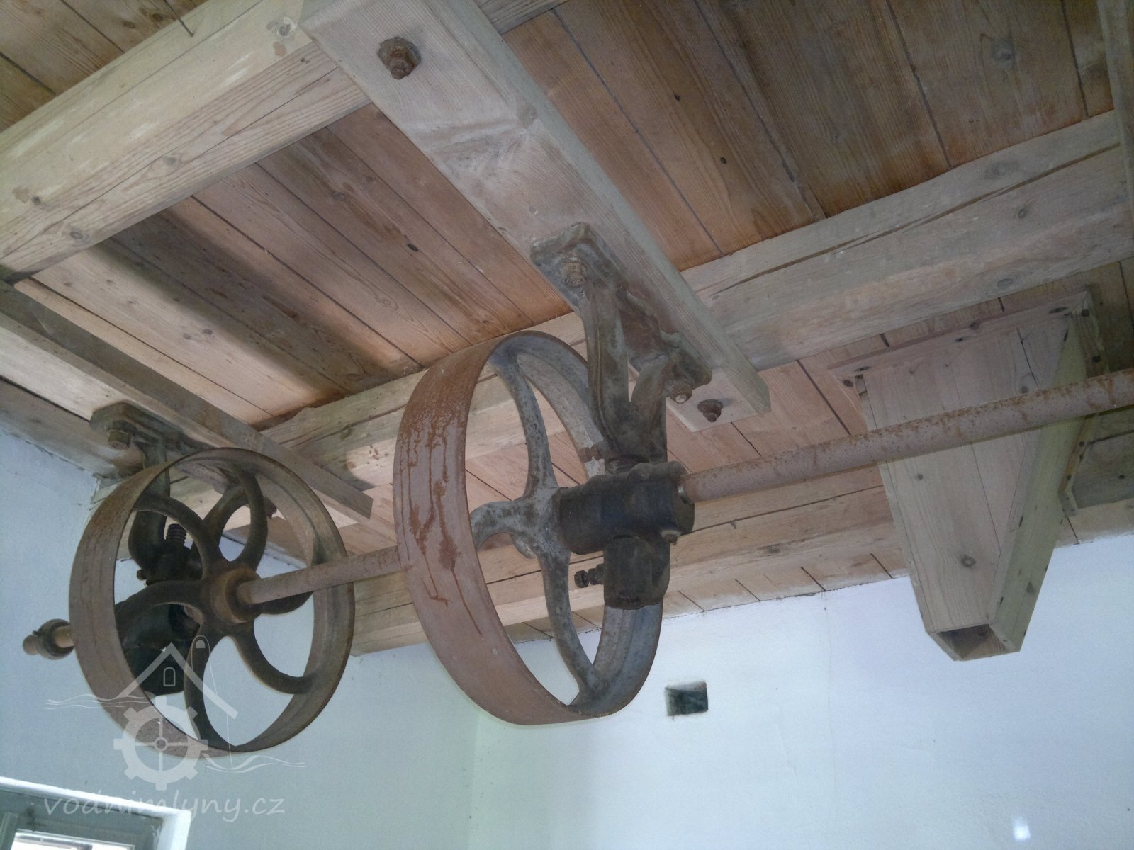 hlavní hnací transmise v podkolí mlýna, 2012, © David Veverka, (Prvky na obrázku: transmise, řemenice, převody)