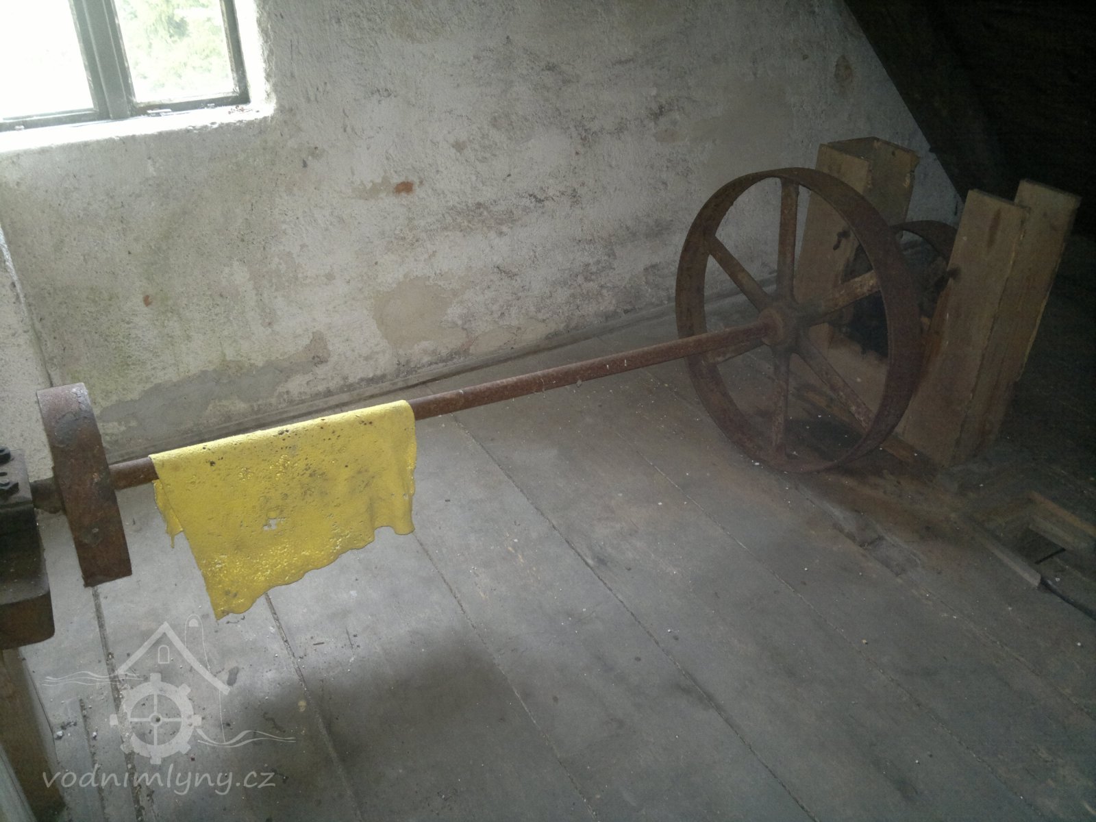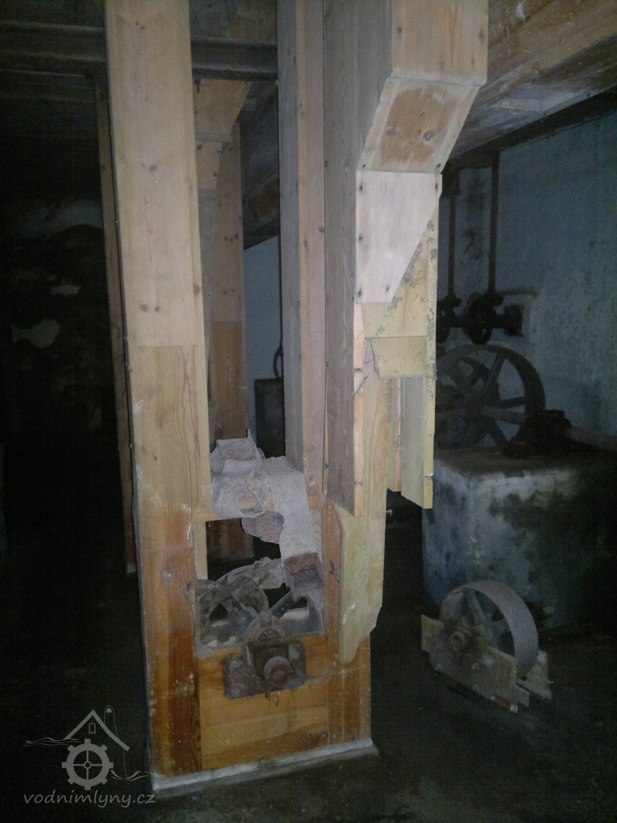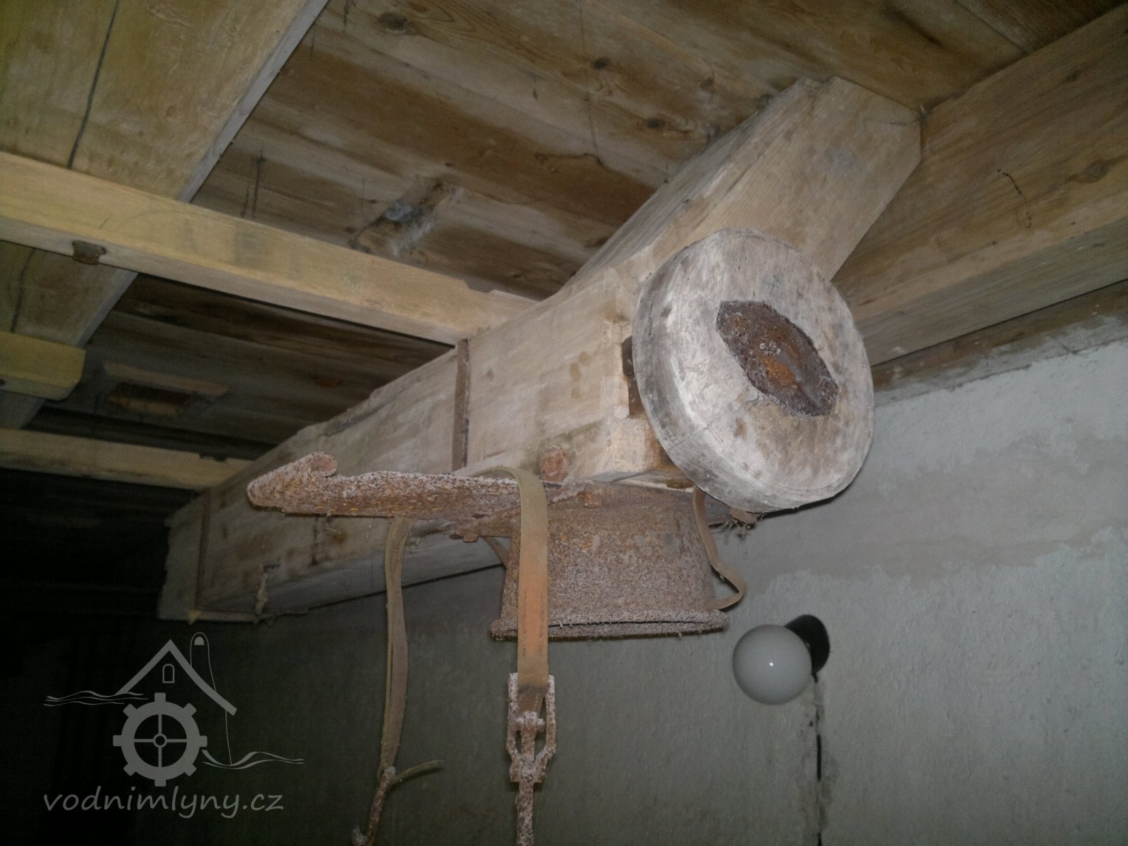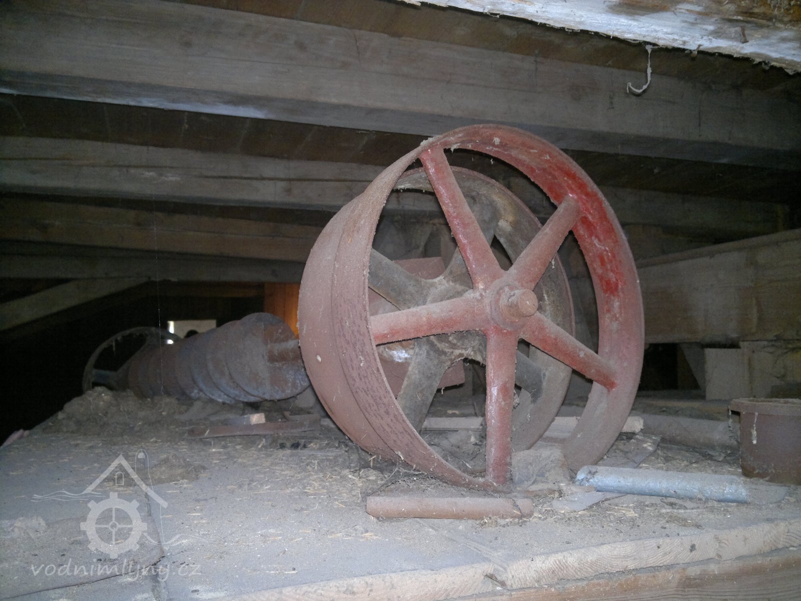 hlava jednoho z kapsových dopravníků v podstřeší s řemenicí z konce 19. stol., 2012, © David Veverka, (Prvky na obrázku: výtahy a dopravníky)