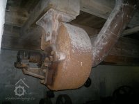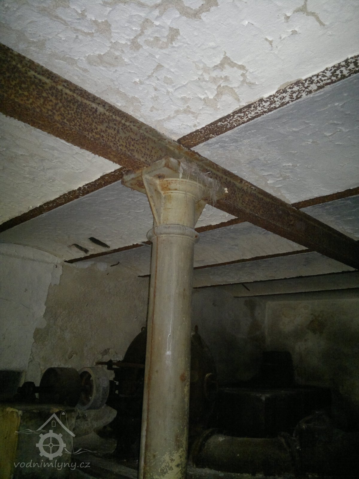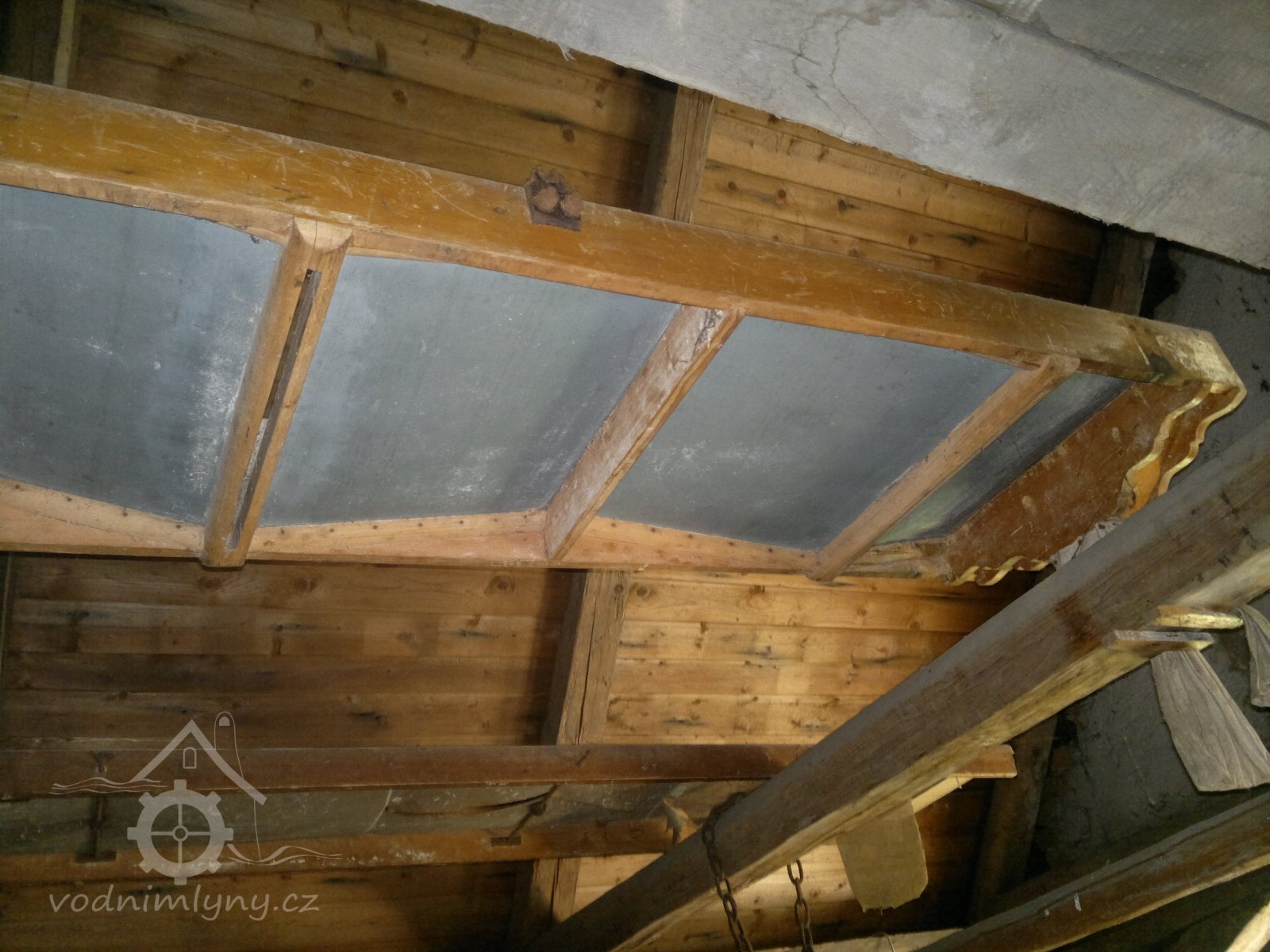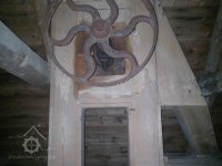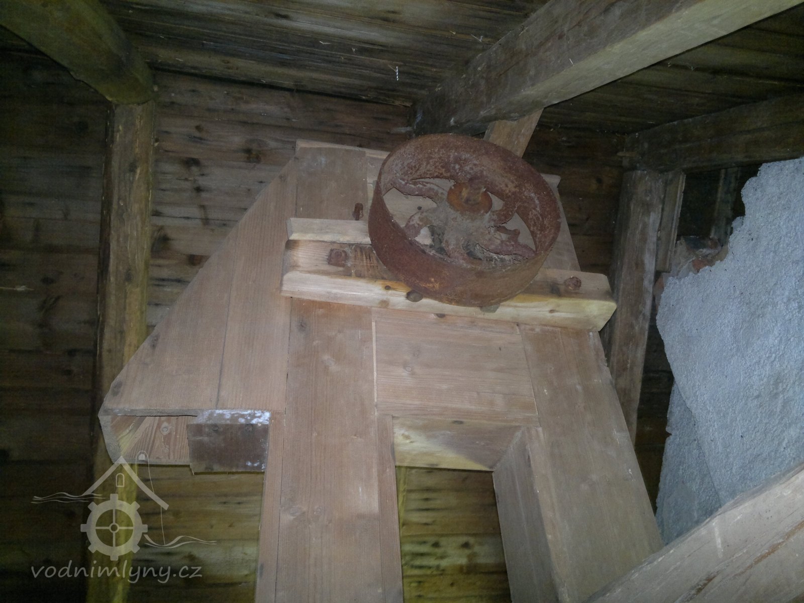 hlava jednoho z kapsových dopravníků v podstřeší s řemenicí z konce 19. stol., 2012, © David Veverka, (Prvky na obrázku: výtahy a dopravníky)
