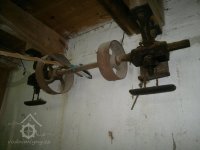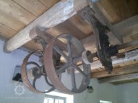 demontovaná transmise v podstřeší, 2012, © David Veverka, (Prvky na obrázku: transmise, řemenice, převody)