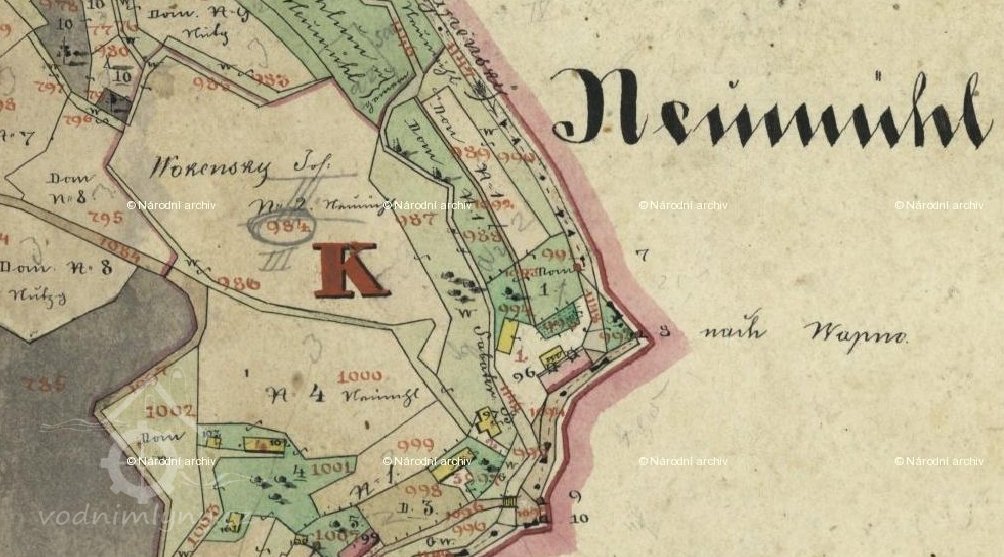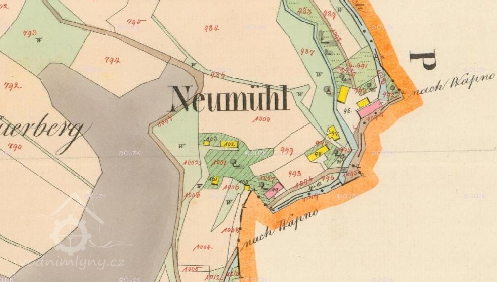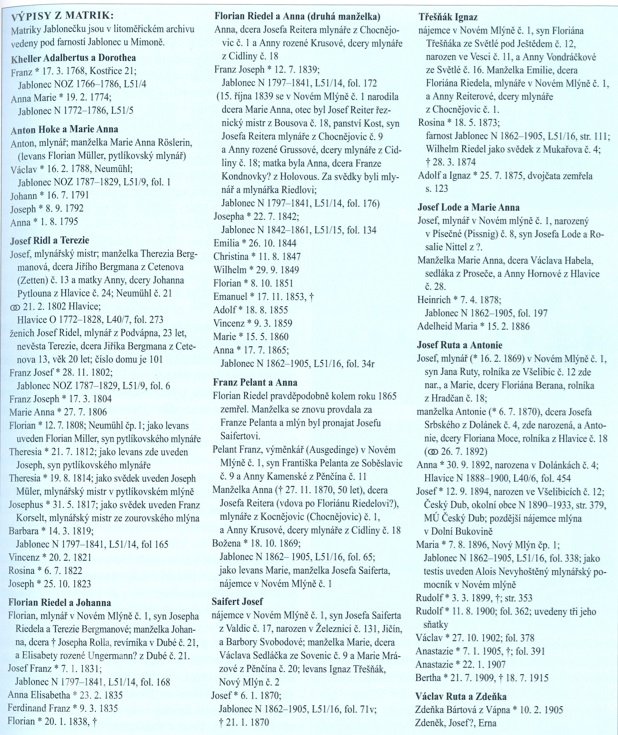 V roce 1802 měl v hlavickém kostele svatbu mlynář z Podvápna Josef Ridl. Za manželku si bral Terezii Bergmannovou z Cetenova. Do roku 1823 se jim na mlýně narodilo 11 dětí. U křtů těchto dětí jsou často jako kmotři zapsáni mlynáři ze sousedních mlýnů Josef Müller a Florián Müller z Pytlíkovského mlýna a Franz Korselt ze mlýna v Zourově. Jako čtvrtý v řadě dětí se narodil syn Florián (1808), který pak po otci převzal mlynářské řemeslo. Florián Ridl (Riedel) se oženil s Johannou Rollovou z Dubé. Když se jim v roce 1831 narodilo první dítě, syn Josef Franz, je již Florián v matrice uváděn jako mlynář v Novém Mlýně č. 1. Do roku 1838 se jim ještě narodily další 3 děti, Anna Elisabetha (1835) Ferdinand Franz (1836) a Florian (1838). V roce 1838 Johanna zemřela a Florian Riedel se znovu oženil. Jeho druhou ženou byla Anna, dcera mlynáře Josefa Reitera z Chocnějovic. V letech 1839 – 1865 se ji narodilo celkem 11 dětí. (MH)