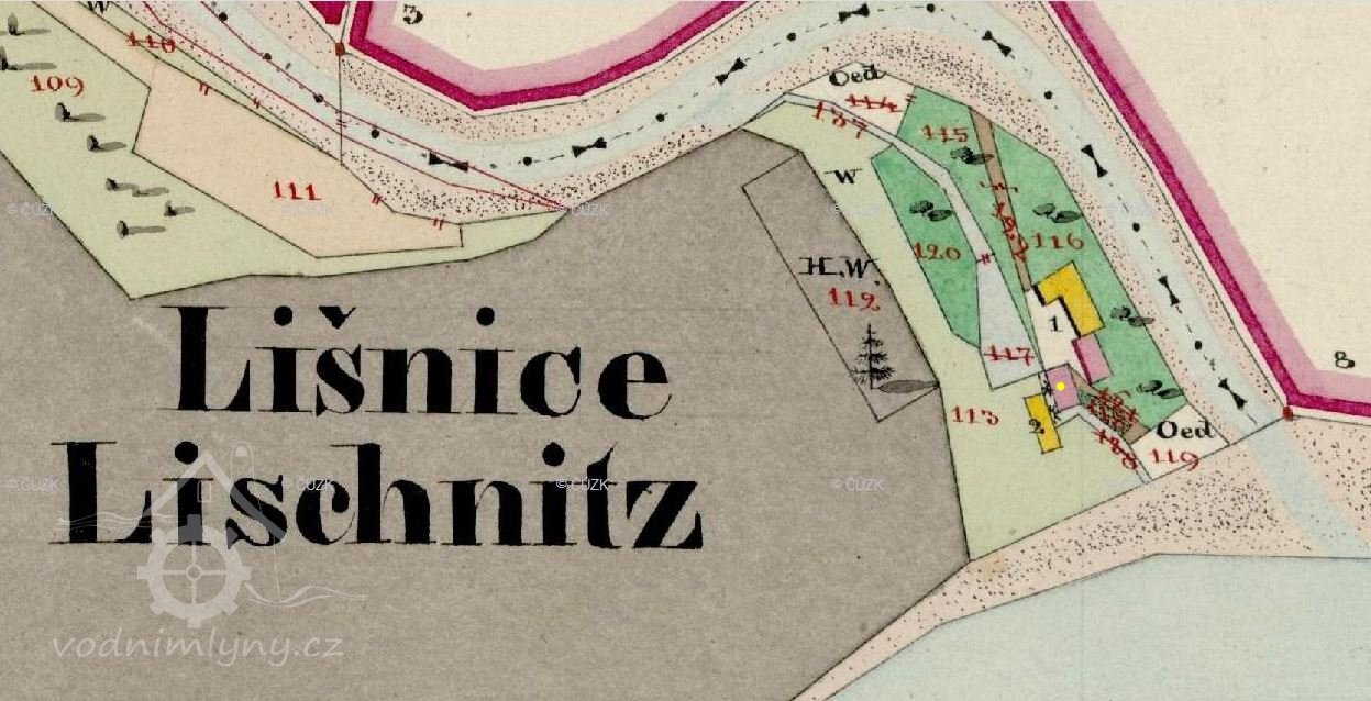 Ve vodních knihách je zmiňováno již jen jedno české složení. Na Císařském otisku jsou však namalována dvě vodní kola. To druhé u žlutě vyznačené budovy mohlo pohánět vodní pilu, která později nejspíš zanikla.