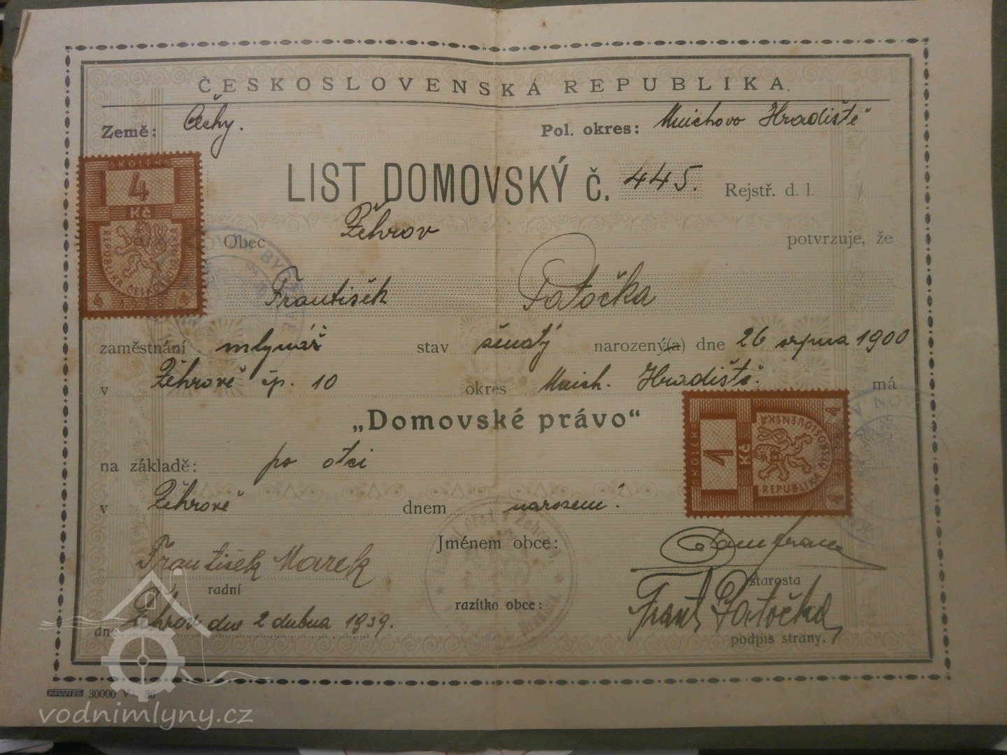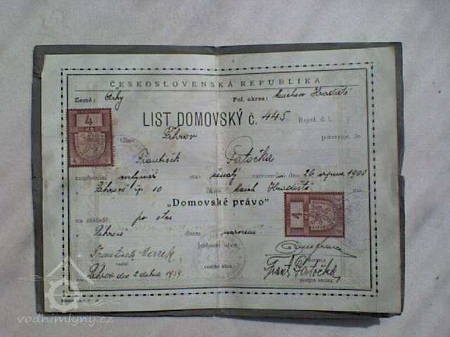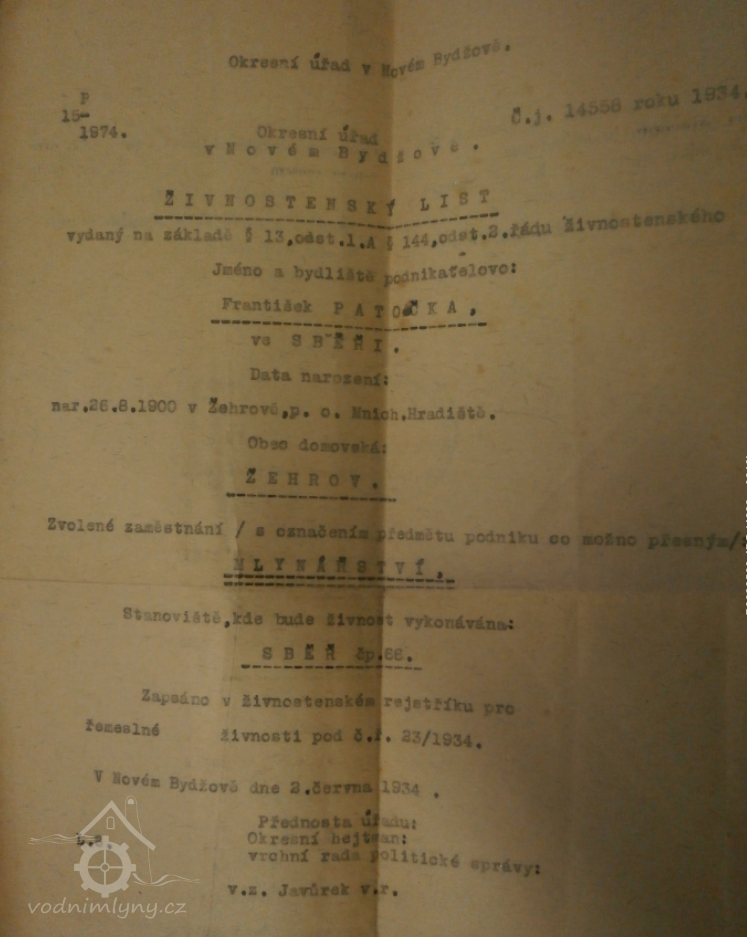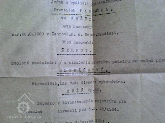 1934 povolení živnosti mlynářské Fr.Patočka (* 1900)