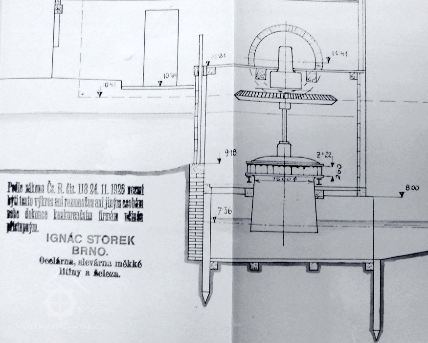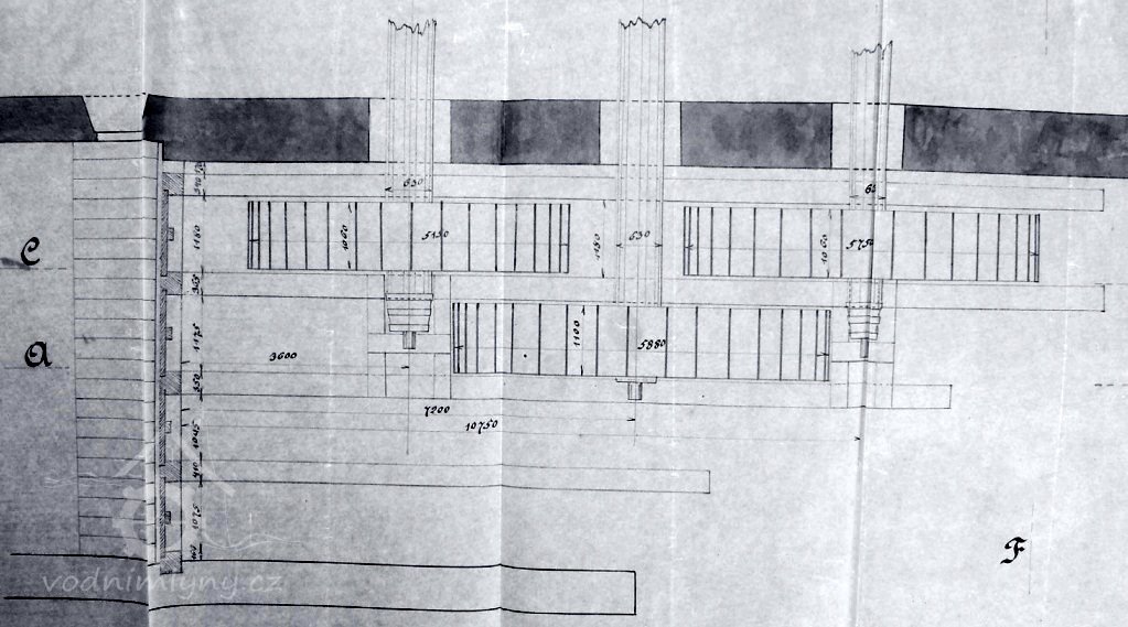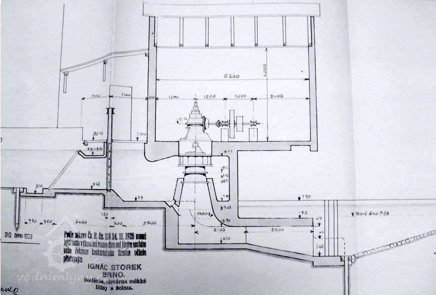 V r. 1930 zde byla Francisova turbína, průtok 1,5 m3/s, spád 2 m, výkon 20 k.