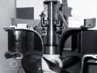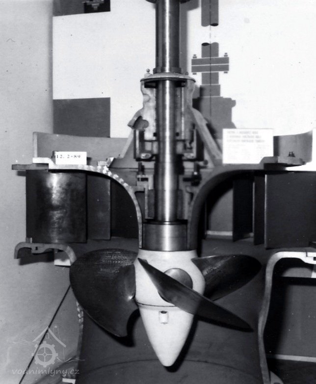 Částečný řez vertikální kašnovou Kaplanovou vodní turbínou vyrobenou firmou Ignaz Storek v roce 1942 pro obilní mlýn