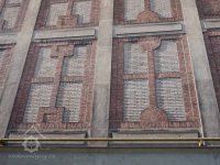 Detail průčelí, 2009, © Wikipedia, Marion1111, (Prvky na obrázku: epigrafické památky (nápisy, datování aj.), plastická omítková výzdoba fasád a štítů, zdobený zděný štít)