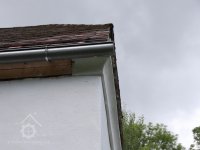 Na římsuje nasazen lichoběžníkový štít polovalbové střechy, nesymetricky přesahující na pravé straně nad zápražím. Štít je vyzděný z cihel, po obvodu lemovaný odsazenou fabionovou římsou, zachovanou v několika fragmentech včetně souvrství vápenných nátěrů.