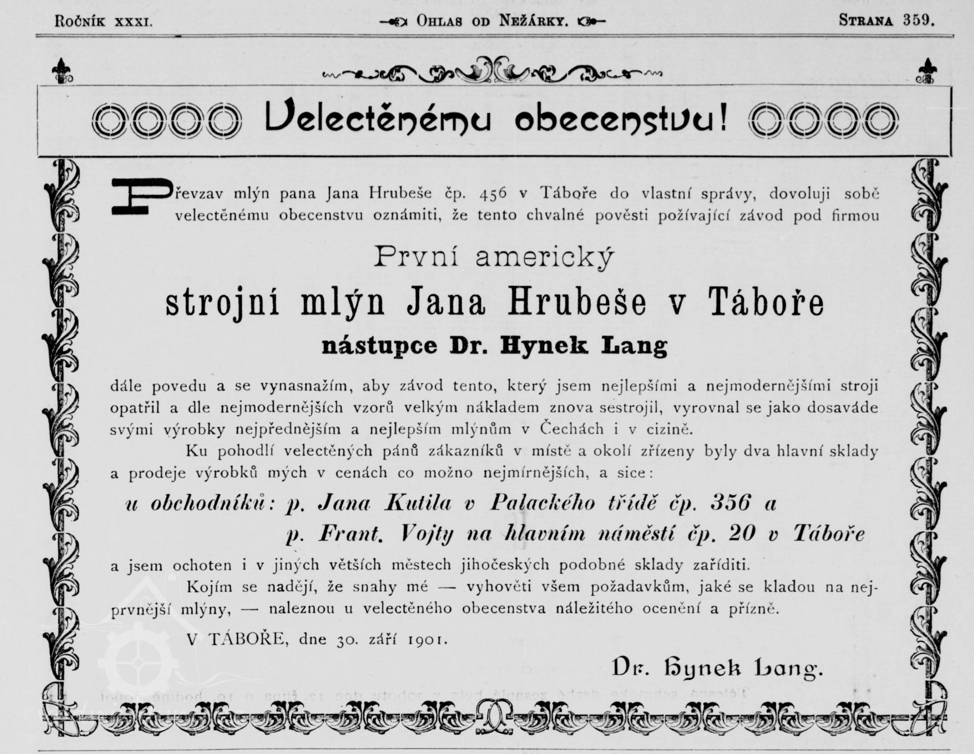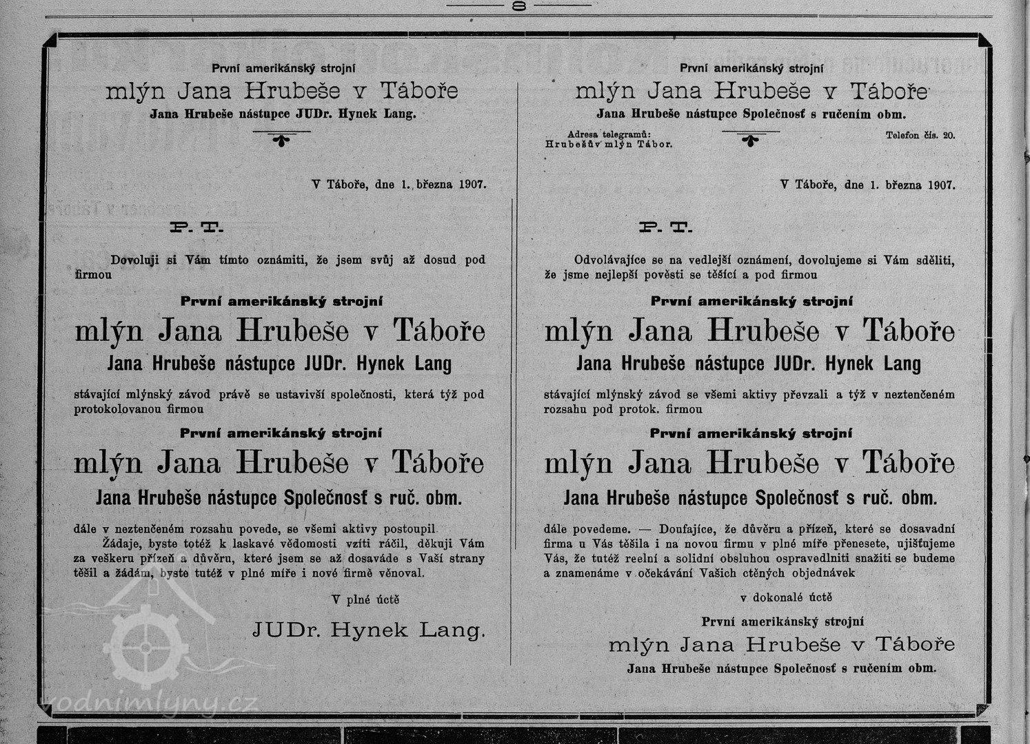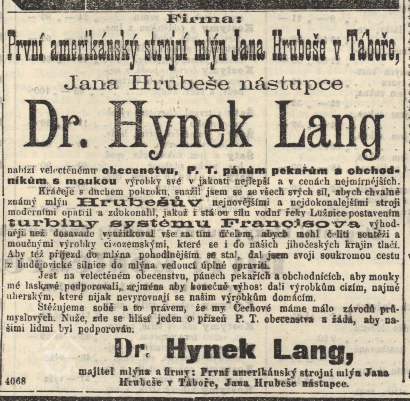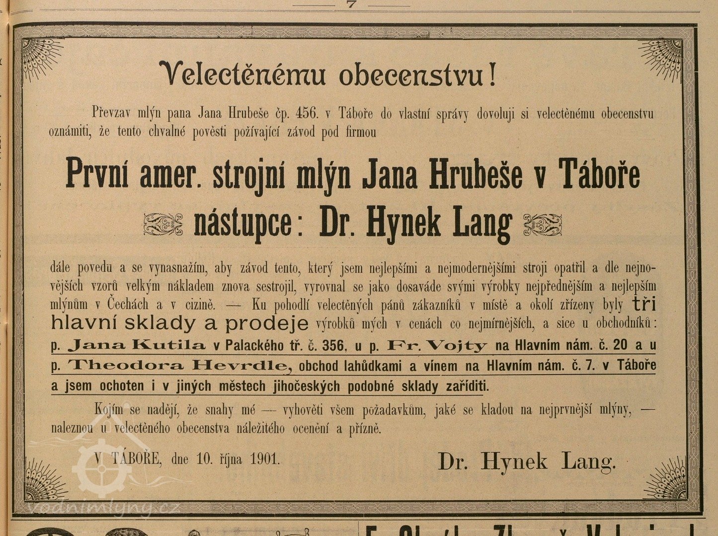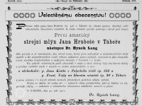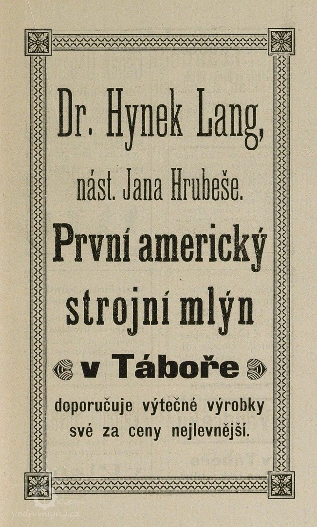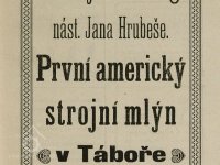 Výměrem místodržitelství z 11.7.1906 schválena výměna vodních kol při mlýně čp.456 v Táboře za Francisovu turbínu. Turbína sschválena 10.3.1909
