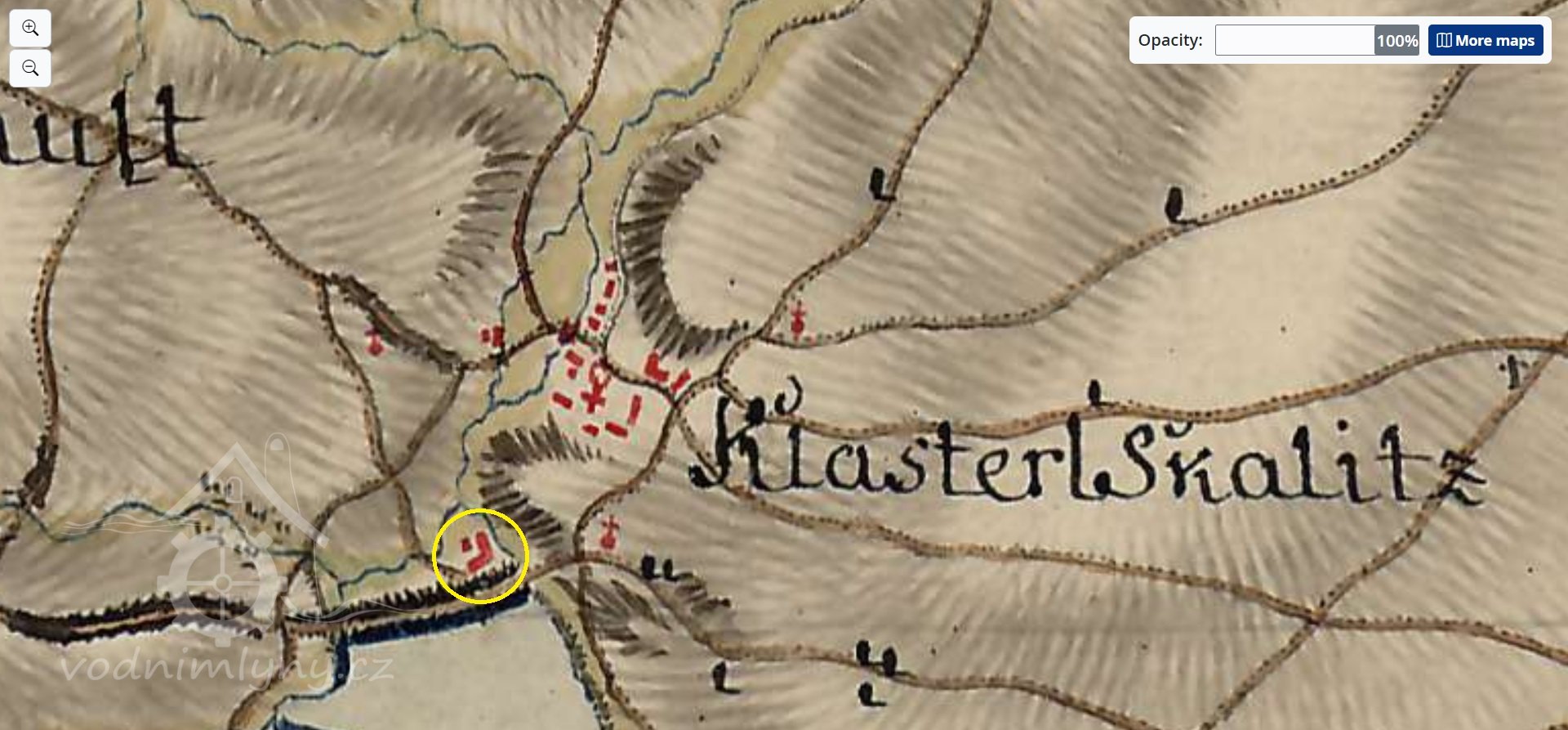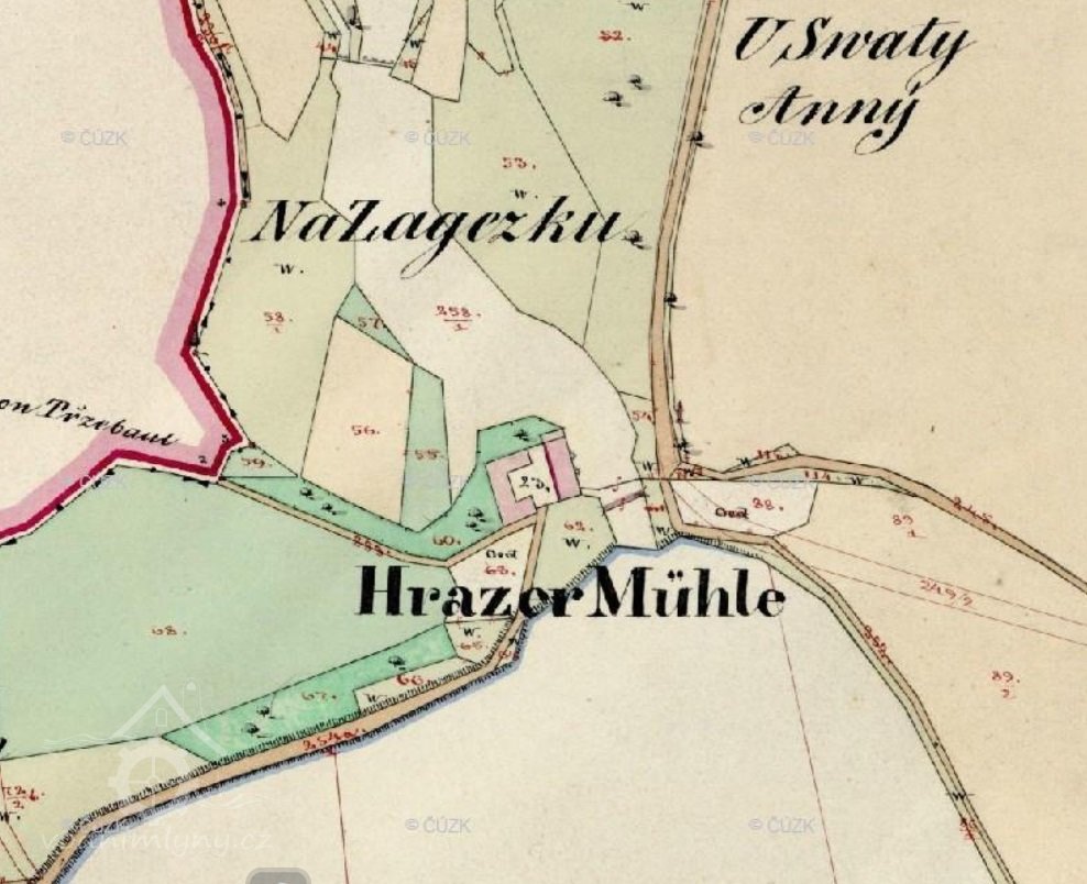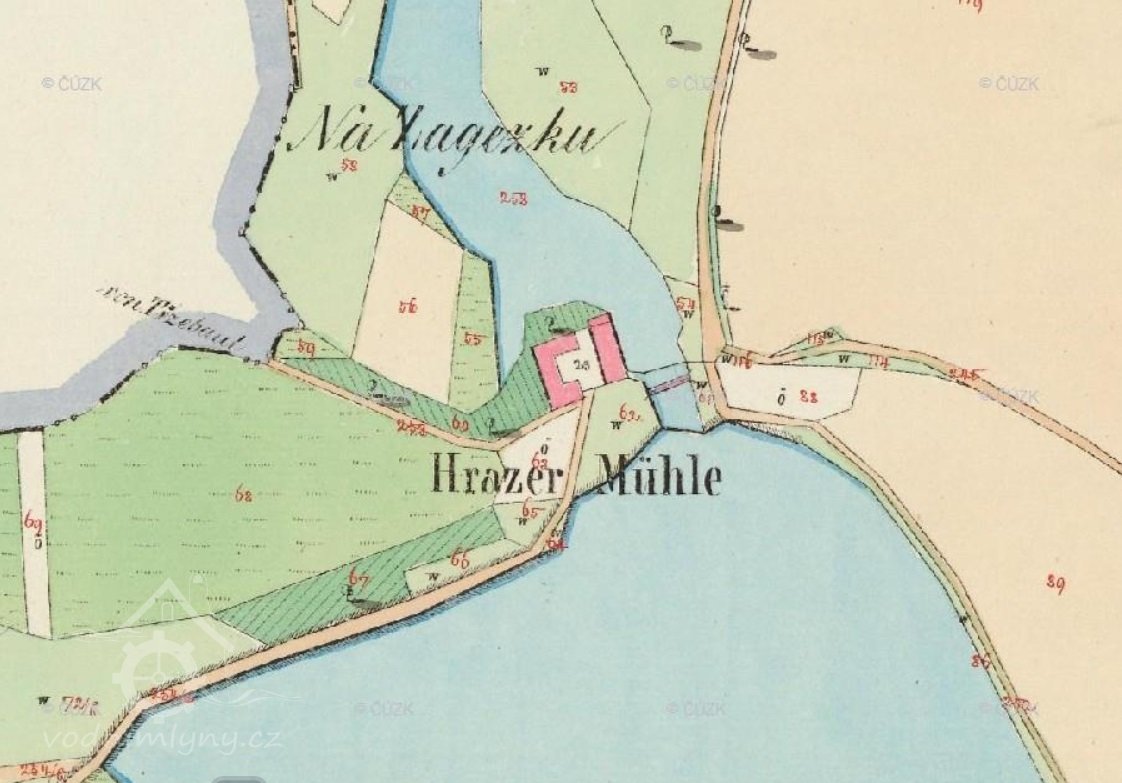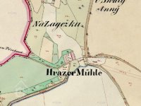 Roku 1677, folio 198n – 200n - urbář Kostelecký Popis bývalých obecních statků města Kouřimě, kdy byly již knížete Lichtenštejna Mlejn Hrázskej pod Kouřimí Ten někdy k městu Kouřimu a důchodům obecním přináležel. Nebo v starých pamětech vynachází, že jest od pánův Kouřimských v létu 1489 vystavený byl. A leží pod rybníkem Hrázský (dříve zvaný Veliký) naproti polední straně a k půlnoci, od země kde strojové nebo mlejnské složení jest, vše od zdi z kamení vyzdvižený tímto způsobem: Předně přijdouce ze dvora od strany západní ke mlejnským veřejům dřevěným jsou dveře na klapačkách, a projdouce skrze ně po čtyrech stupních dřevěných níže od země a do mlejna, nacházejí se mlejny nebo složení pro mletí mouky s kolmi vodními, palečními a všemi potřebami příslušejícími po straně vejchodní dvoje. I ten předce v tý straně kolo vodní a proti němu ve mlejně jahelka se všemi potřebami. Zase čtvrté kolo vodní s hřídelem, pupky, které táhne 5 stup a pod nimi jest štok ze dřeva spůsobený. V tom mlejně je oken 5 bez skel, na západ 2, na vejchod 3, a dvířka s klapačkou nad lednicí okolo strojů mlejnských, podobně stup podlaha z prken falcovních, aby se obilí rozsejpati nemohlo, uděláno jest. Item okolo vodních kol zděná lednice, a místem, kde potřeba ukazuje, prkny opažena, aby voda od kol stříkající se zdí vápno nevyplachovala. Opět z toho mlejna dřevěný veřeje s dveřmi na pantech do komory zděný klenutí jsouce hrubě rozpukány, sloupy a kříži podtaženy, což mlynář pro dobytek hovězí potřebuje. A za tím ještě jedna komora zděná, pod světnicí prázdná; do těch komor okna 2 bez skel. Z toho mlejna nahoru na líhách tesány schody do hořejšího stavení a podlahu nade mlejny na falc složenou pro sejpání obilí. Druhé stavení hořejší následuje : sejdouce s hráze rybníka, slove Hrázského, přijde se na pavlač (podle vantroků) toliko vyštocholcovanou po straně vejchodní, a z té pavlače veřeje dřevěný s dveřmi na pantích do síně na západ. Z té síně dveře na pantích do světnice, roubeny na poledne, v ní okna na vejchod zabedněny, jedno na poledne se skly 2 a na západě též se sklem 1. Kamna prostý na zděným. Topení ze síně s pláštěm mazaným a komínem štycholcovaným. Pec pro pečení chleba pod zákamní do světnice jedna. Zase z té síně veřeje na podlahu na falc složenou nad stroje mlejnské, což se za síň nebo sejpku pokládá. Na ní okna na vejchod bez skel 2, na západ 2 a schody na líhách tesány na svrchní podlahu dílem mazanou a ostatek z prken kladenou. Opět z té síně komory 2 k půlnoční straně s dveřmi na pantech, v nich podlahy nad stroji mlejnskými na falc složeny. To všechno stavení hořejší (mimo světnici roubenou) na vazbu a lepenici postaveny jest. Nad tím celým štokem krov náležitý postavený, šindelem pobitý jest, na poledne štít prkenný, v něm dvířka na pantích a na západ svisle jsou. Opět zpředu jmenované síně a hořejšího stavení, jest pavlač s podlahou po obou stranách na štycholce mazaná, krůvkem přikrytá a šindelem pobitá, přes dvůr do druhého štoku z kamene vystaveného, v němž se nacházejí při zemi zděná maštal pro 6 koní nebo dobytka hovězího. Proti té pavlači komora prostřední zděná s dveřmi na pantích, a z ní do hořejší (v třetím vejšky stavení) komory schody na líhách tesány. Ten štok krovem přikrytý krakolci pro bezpečnost zdí od trámů stažený a šindelem pobitý jest. Při tom dotčeném štoku při zemi podle maštale jsou dva chlévy roubeny, nebo krmníky sviňsky, jeden na západ a druhý na půl noci, s dveřmi trojími na klapačkách, toliko námětky přikrytý a došky pošitý. Zase naproti tomu mlejnu a štoku zděnému jest při hrázi stodůlka o jednom zádění s mlátkem, kdež někdy nějaké chlívky bejvaly, přikrytá krovem a došky pošitá. Item proti strojům mlejnským na dvorečku klenutý podzemní sklep bez přikrytí, sdveřmi na klapačkách. Skála tvrdá křemenitá po straně proti splavu a vantrokám mlejnským. Z toho mlejna platí mlynář nájmu ročně : Vepře 4 nebo za každého po 8 zl. 10 kr. rýnských. Žita 50 korců, nebo za každý korec odvésti peníze vedle trhu v kraji jdoucího a potřeby vrchnosti. Otrubů žitných 25 korců. Od p. Havla r. 1677 zvejšen o 2 vepře a 14 kop míšeňských. K nájmu se mlynářovi přidává ode dvora Zárybnického rolí k osívání 2 kopě záhonů. Item palouček nad rybníkem Hrázským a cestou, jdouce do Kouřima po pravý ruce na poledne, na němž nakliditi může sena 1 vůz. Item jdouce k pustému dvoru Zárybnickému štěpnice s 15 štěpy, dílem višňovým, kouskem štěpnice, rolí pro předivo a ostatek s pláněmi. Palouk a zahrada odňata ke dvoru Zárybnickému. K tomu mlejnu přináležejí s melivem ves Lipany a Dobré pole.