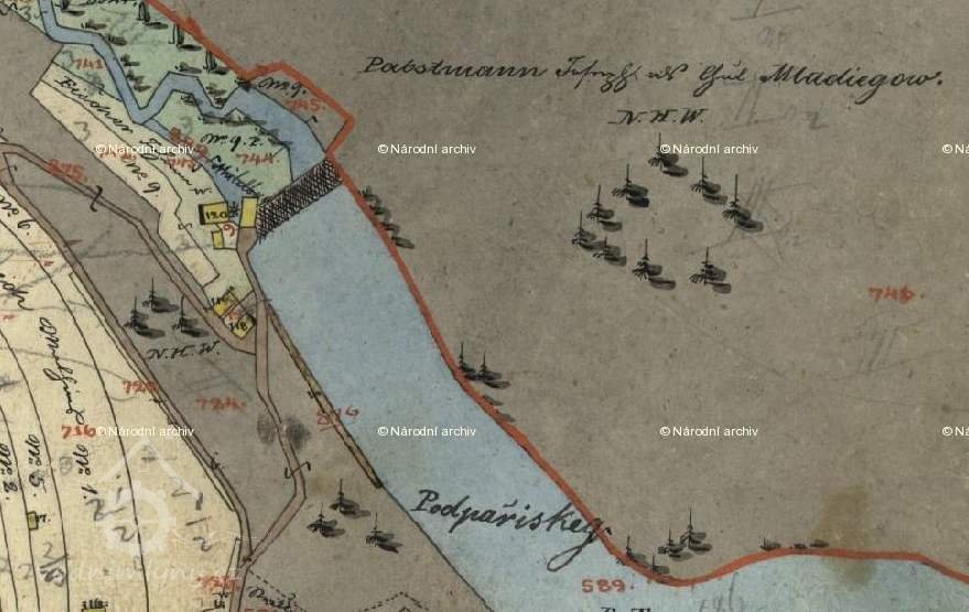 1754 - v tereziánském katastru uveden "mlýn o jednom kole s pilou na nestálé vodě v majetku statku Mladějov, nad mlýnem rybník Podpařzský"