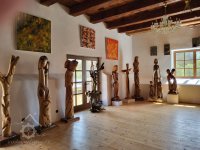 Výstavní síň ve mlýnici, 05 2024, © Ivana Veselá, (Prvky na obrázku: tesařsky zdobené podpůrné sloupy, trámový strop)