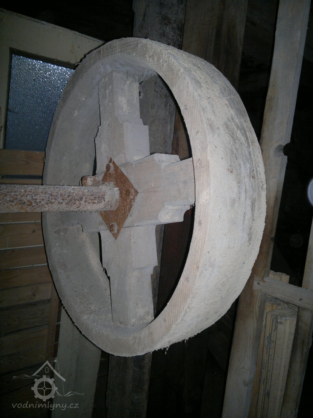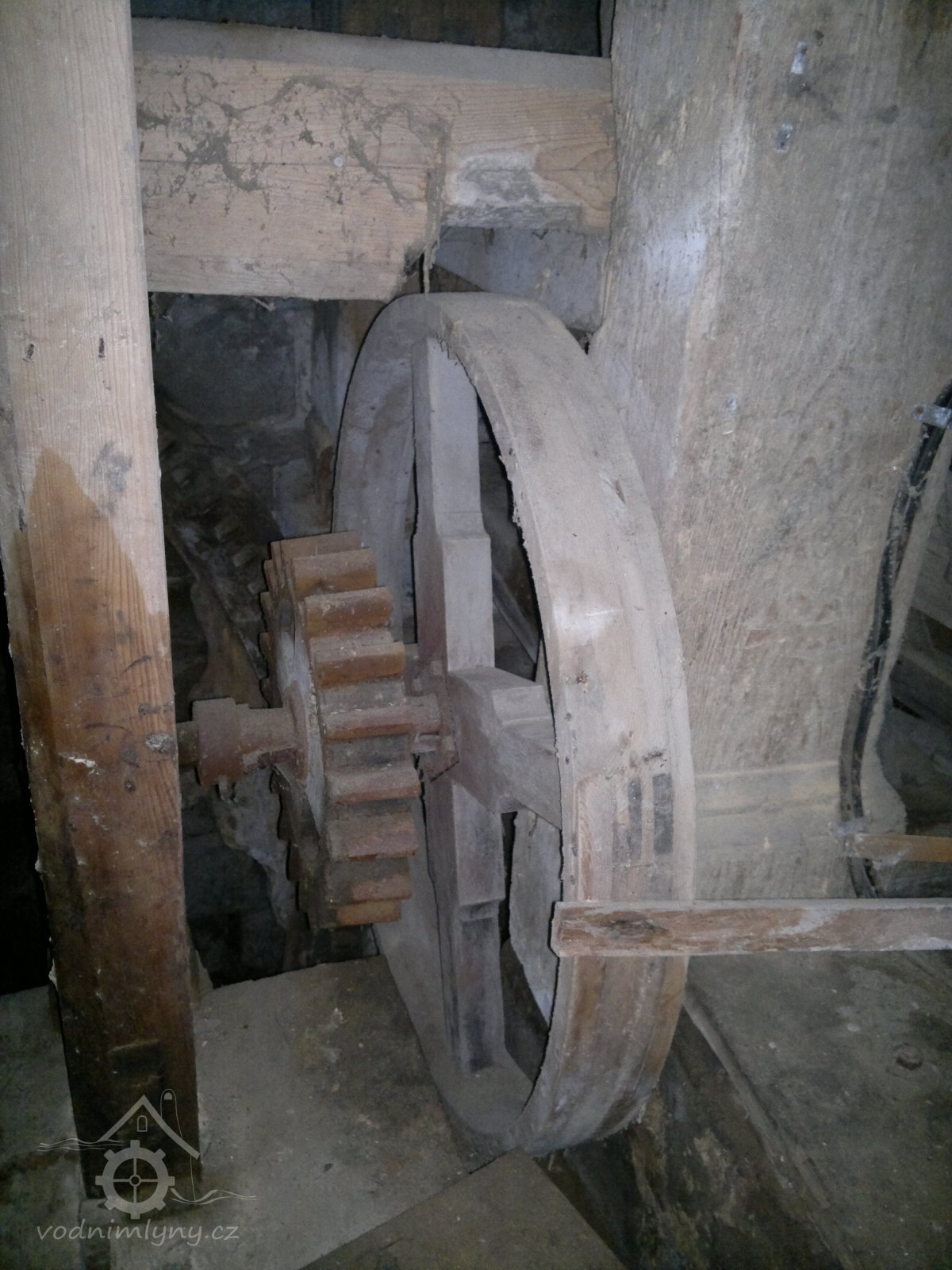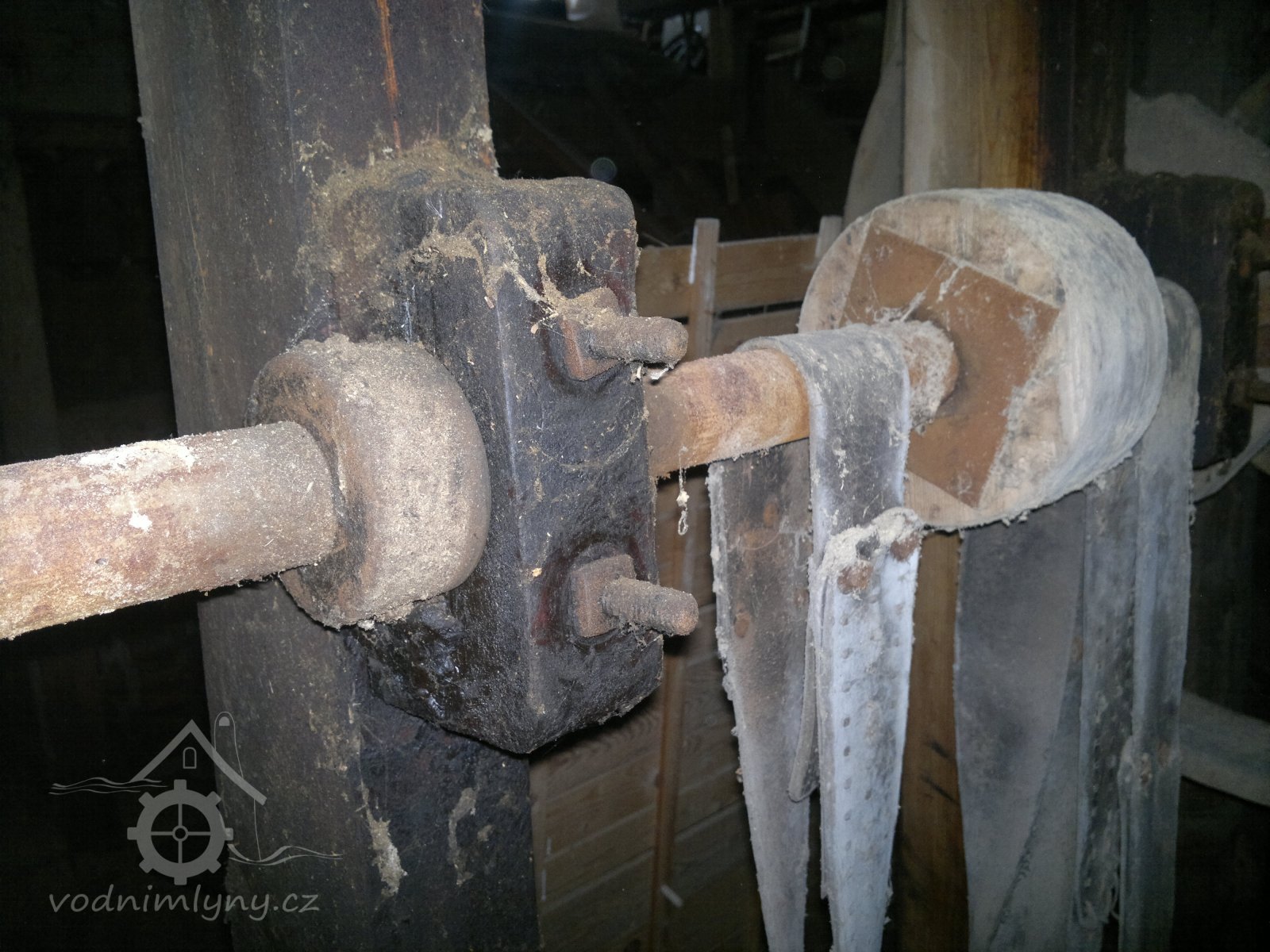pohon umělých mlecích kamenů od palečního kola přes pastorek, 2013, © David Veverka, (Prvky na obrázku: transmise, řemenice, převody)