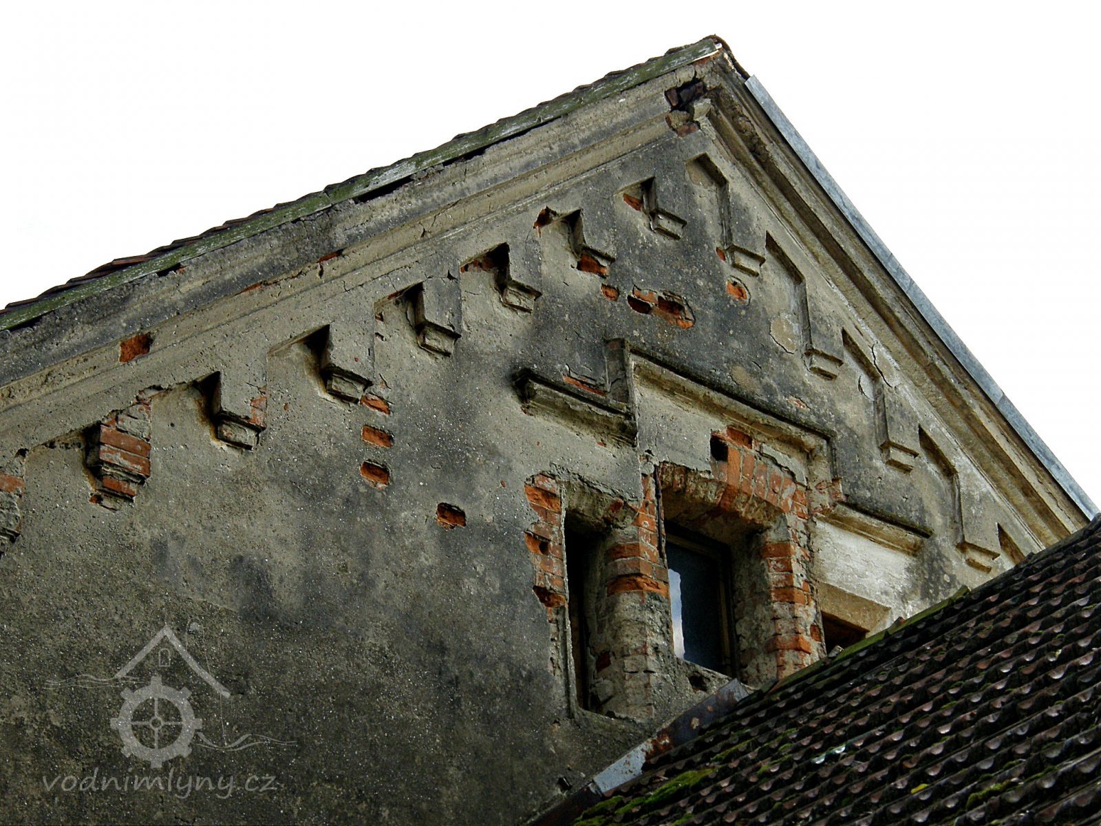 Pohledem voyera na štít jižní strany mlýna, 2014, © Kolssteyn, (Prvky na obrázku: plastická omítková výzdoba fasád a štítů)