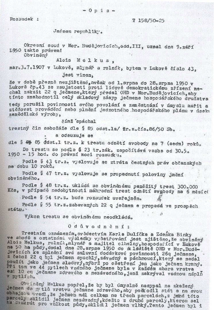 Během války byl celý kraj aktivně zapojen do protinacistického odboje a stejně tak i vícenický rolník Jaroslav Melkus (1900 - 1953) odmítal po válce vstoupit do družstva. Ve vykonstruovaném procesu tzv. Babické kauzy byl odsouzen k trestu smrti. Jeho mladší bratr, mlynář Alois (*3.7.1907), byl křivě odsouzen a zatčen na 7,5 roku, spolu s dalšími 106 odsouzenými v této kauze, kde režimu nepohodlným osobám padlo celkem 1200 let vězení a 11 trestů smrti.