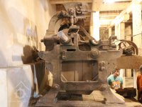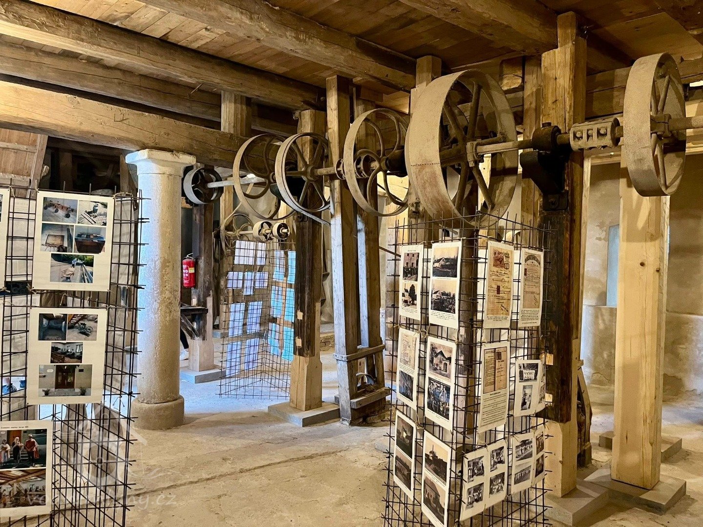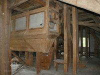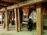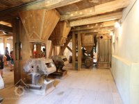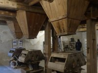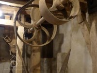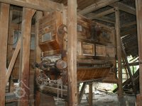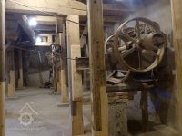 Interiér mlýnice, 2011, © Jan Pešta, (Prvky na obrázku: transmise, řemenice, převody - transmisní hřídele s řemenicemi (výrobek průmyslový i řemeslný), mlýnská hranice, válcová stolice)