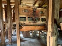 Transmise k mlátičce, 05 2025, © Tomáš Jílek, (Prvky na obrázku: transmise, řemenice, převody - transmisní hřídele s řemenicemi (výrobek průmyslový i řemeslný), pohon zemědělských strojů)