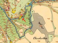 To dříve to bylo jiné. Louka patřívala k mlýnu, který stával v místě, kde později byla zřízena pila. Za mlynářem Jandou přišel r. 1856 neznámý muž a prosil ho, aby mu dovolil kopat na jeho louce, že je tam určitě zakopán poklad. Ten muž se jmenoval Josef Lacina a byl ze Starého Bydžova. Mlynáři vypravoval, že viděl tu čarodějnickou knihu a přesně ví, kde poklad hledat. Tak se nakonec dohodli – přes den bude Lacina vypomáhat ve mlýně, za což dostane jídlo, nocleh a mlynář mu zapůjčí nářadí, a jinak si může na louce kopat. Tak tomu také bylo. Ale kdo si myslel, že po několika dnech či týdnech marná lopota Bydžováka odradí, byl na omylu. Neúnavně, den co den, ráno před prací na poli a po ní, i dlouho do noci, kopal a kopal. Vždy vyhloubil díru asi 1x1 metr širokou, pak ji zaházel a začal kopat vedle. Celkem takhle kopal dvacet let, jen jednou za rok se vypravil za sestrou do Bydžova, ale nikdy se tam nezdržel. Lomničtí si na jeho kopání zvykli a za pár let brali zvonění krumpáče o kameny pod Chocholkou jako samozřejmost. Lacina se s nikým moc nebavil, nikomu nepřekážel, byl tichý a skromný, žil jen s vidinou budoucího bohatství. Musel jím být snad posedlý, že to vydržel tak dlouho. Jednou se z návštěvy v Bydžově již nevrátil a nikdo neví, co se s ním stalo. Snad dostal rozum a dvacet let marné práce mu již stačilo. Lomničtí na něho ještě dlouho vzpomínali a pověsti o pokladu pod Chocholkou věřil poté jen málokdo, vždyť louka byla celá několikrát překopána.