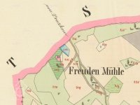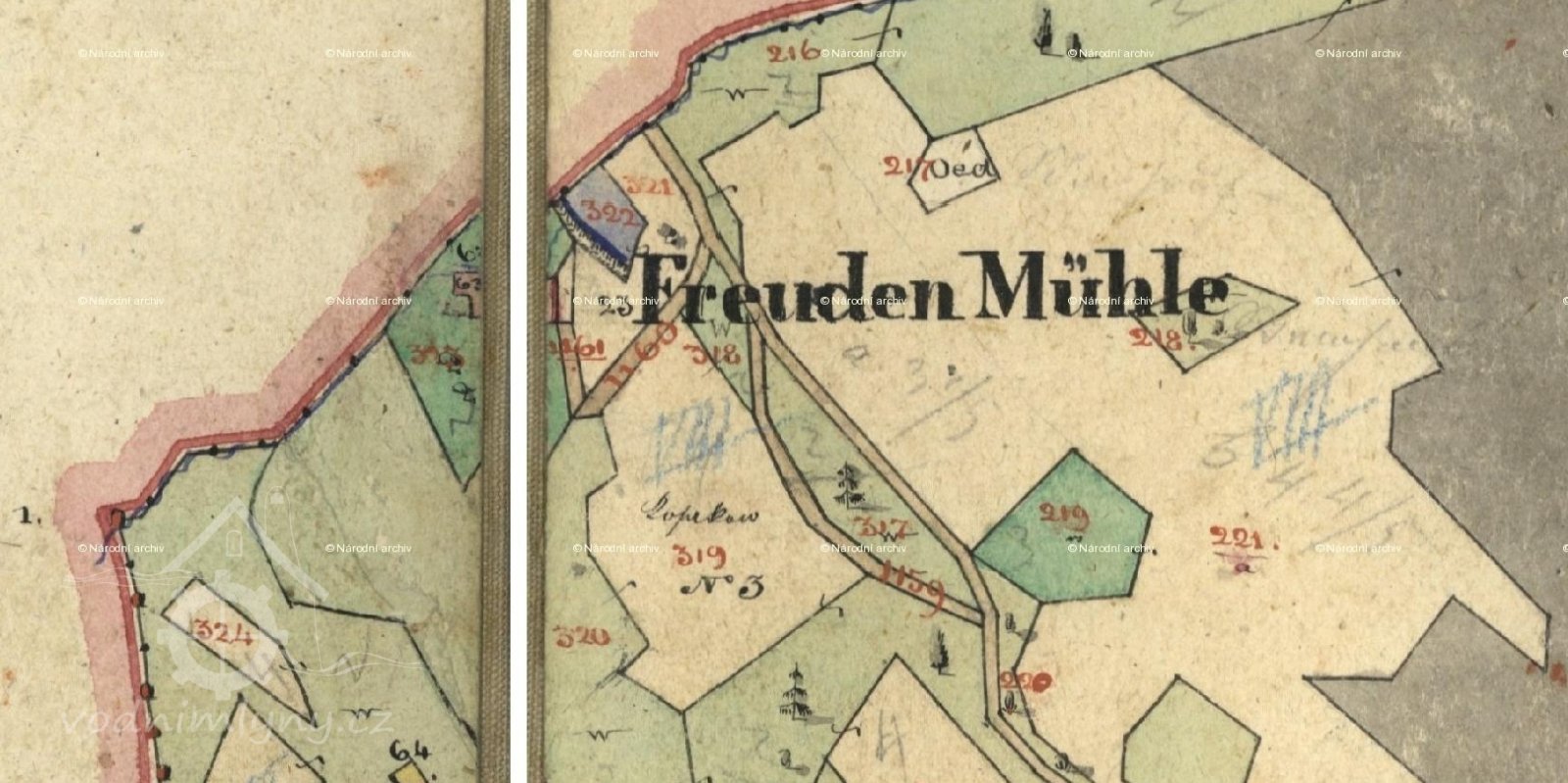 Výňatky z protokolu z 5. října 1881: "Komise sestoupivší se v mlýně samém, odebrala se na místo šetření a shledala, že mlýn - přízemkové to stavení dřevěné na kamenném spodku, šindelem kryté - je na levé, jižní straně vodovodu. Mlýn je zařízen na vrchní vodu a má jedno obyčejné složeni. Voda ku hnaní mlýnského stroje přichází z vrchu Kozákova, kdež vzniká v prameni zvaném Radostná. K zjištění nápadu (spadu) u mlýna toho vytesala se v kvádru rohovém v sedmé vrstvě zdi na severní straně budovy vodorovná rýha, a sice ve vodorovné výšce se středem čepu vodního kola, která byla vytesána a vyznačena dle připojeného obrazce. (V. K. 1881) Měřením se vyšetřilo následující: Dřevěný žlab je na začátku v nádržce 143 cm pod korunou hráze nádržky a leží 6,68 m nad rýhou - normálním znamením. Konec žlábku u kola 6,6 m, normální znamení leží 6,6 m nad půdou podkol. Obnáší tedy nápad mlýna toho 14,8 m. Na to přikročeno ku zjištění vodních práv tohoto mlýna, jež záleží dle výpovědi vlastníka mlýna, pak přítomného zástupce obce v nerušeném užívaní vody z pramene Radostné ku hnaní mlýna, pak ve vyklizení vodní strouhy bez odporu držitelů sousedních pozemků."