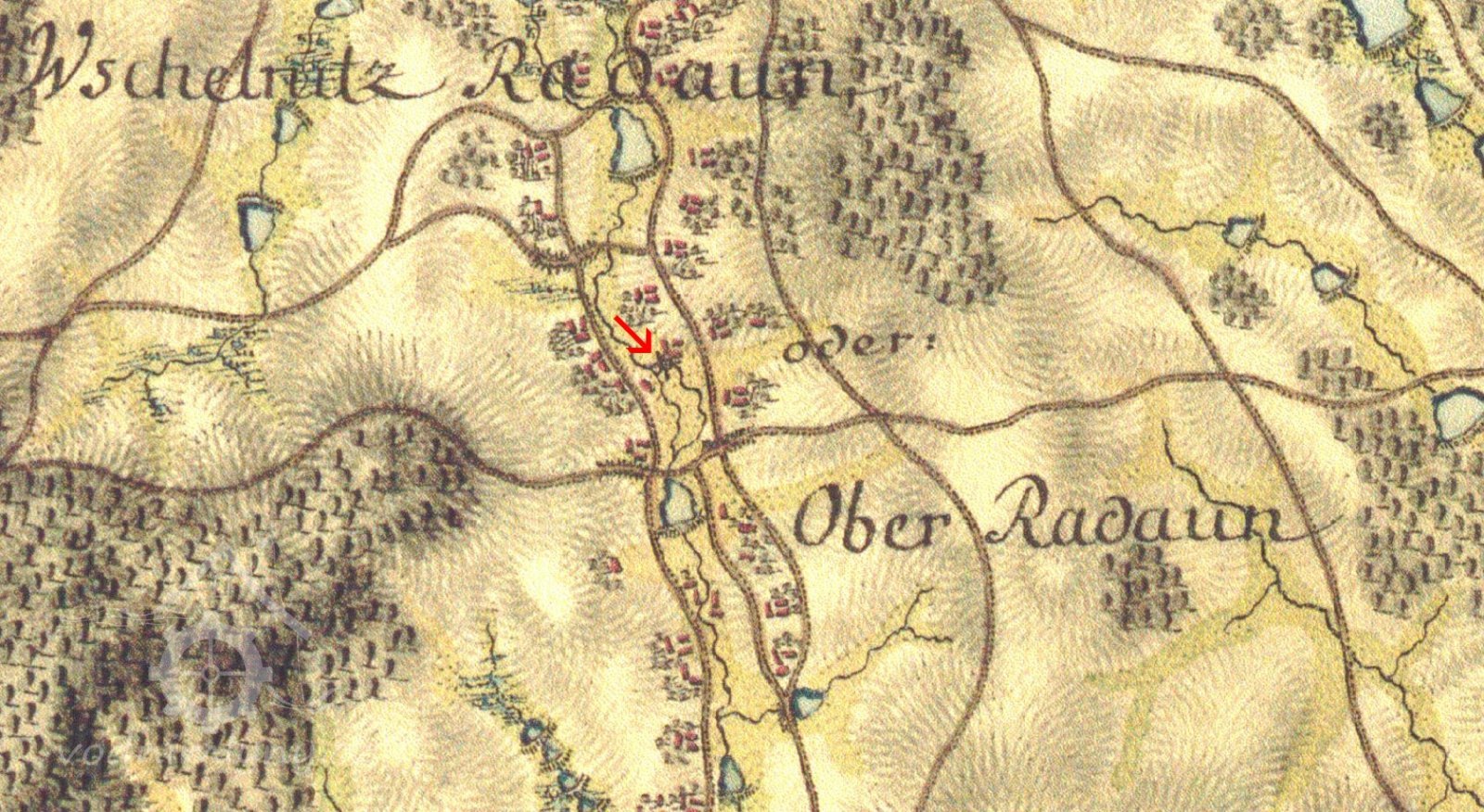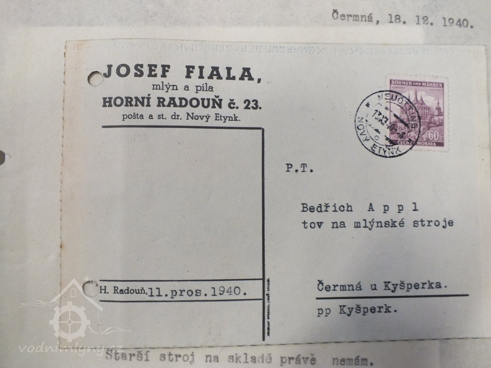 Místní obec Horní Radouň, osada Horní Radouň, mlýn čp.23, pila a šindelka, na potoce od Bozděchova přicházejícím. Držitel: Vít Půlpitel (škrtnuto), dle sdělení okres. soudu v Kamenici nad Lipou z 3.1.1902 jsou knihovními držiteli Tomáš a Marie Fialovi.