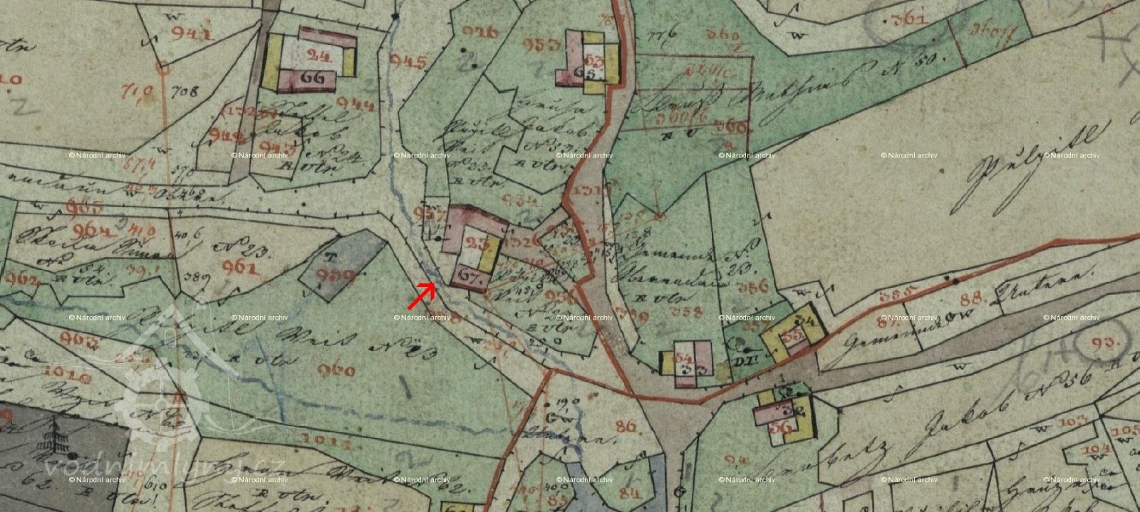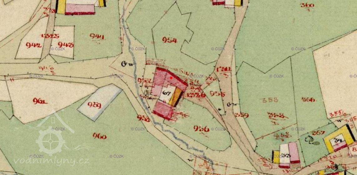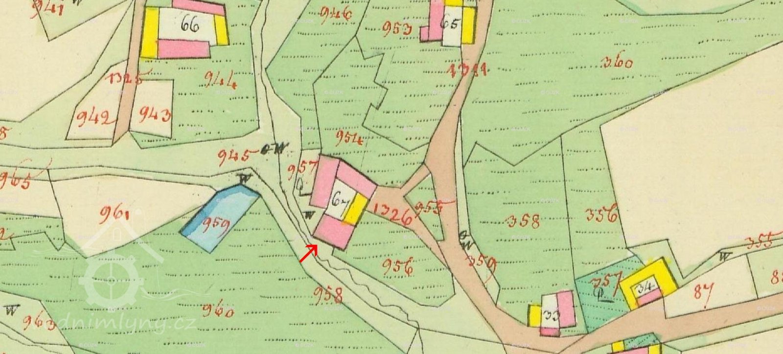 „Potok přicházející od Bozděchova rozšiřuje se nad mlýnem v malou nádržku, z níž skrze hráz vedou dvě dřevěné trouby, jimiž se voda přivádí na vodní kola. Trouba vedoucí na pilu jest při vyústění 35 cm široká a 30 cm vysoká, druhá trouba vedoucí vodu na mlýn, stoupy a šindelku jest přu vyústění 30 cm široká a 24 cm vysoká. Na počátku těchto trub v nádržce reguluje se voda čepem ve světlosti 12 cm do čtverce velkým. Stavítko u mlýnského žlabu k mlýnu a šindelce jest ve světlosti 40 cm široké a 22 cm vysoké, druhé stavítko v tomtéž žlabu ke kolu stupnímu je 16 cm široké a 19 cm vysoké. Ve žlabu pro pilu jest ve dně jeho vyříznutý otvor 45 cm šířky a 95 cm délky uzavíraný poklopem k zvedání. Celkový spád užitečný měřeno od dna trub při vyústění až na dno lednice činí 4,5 m. Voda jest zde počáteční a lze jí uvésti v pohyb jen jeden stroj.
