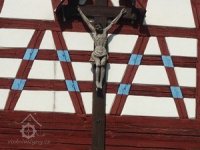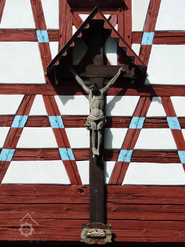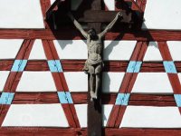 obnovený krucifix ve štítu, 04 2014, © Jaroslav Vyčichlo, (Prvky na obrázku: hrázděný štít, umělecké prvky (sochy, malby, reliéfy))