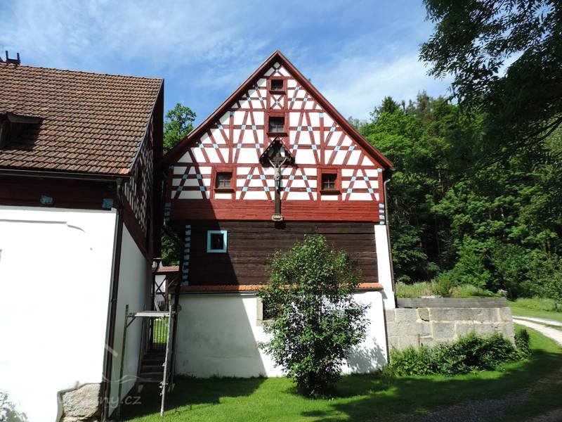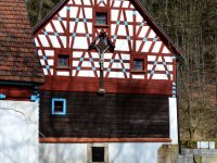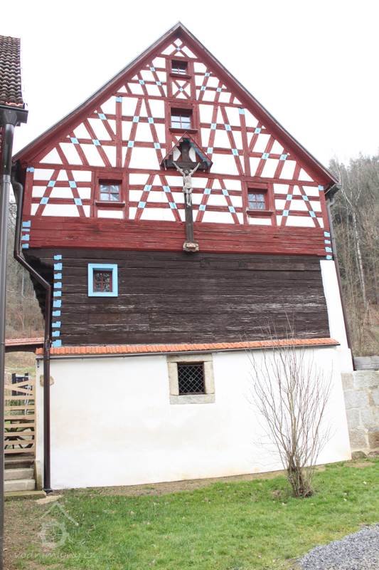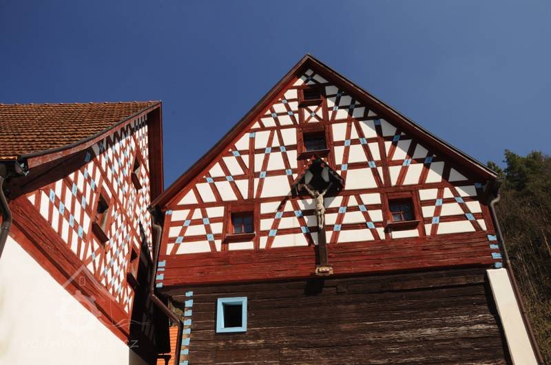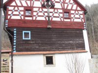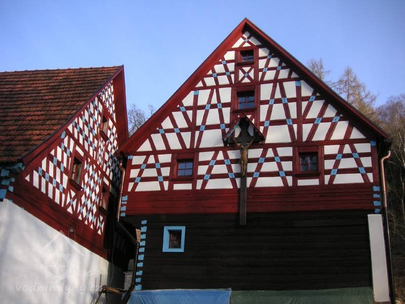 zdobený hrázděný štít mlýnu, 04 2014, © Jaroslav Vyčichlo, (Prvky na obrázku: hrázděný štít, umělecké prvky (sochy, malby, reliéfy))