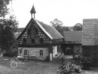 Pohled na obytnou část od JZ., 04 2004, © Milan Šauša, (Prvky na obrázku: hrázděný štít)