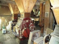 Mlecí podlaha. V popředí periodická loupačka, za ní šrotovník s kameny na svislé hřídeli a následují válcové mlecí stolice., 2008, © Urbánek