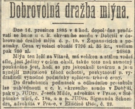 1895 dražba mlýna za vyvolávací cenu 7796 zl. 35 kr. (RR)