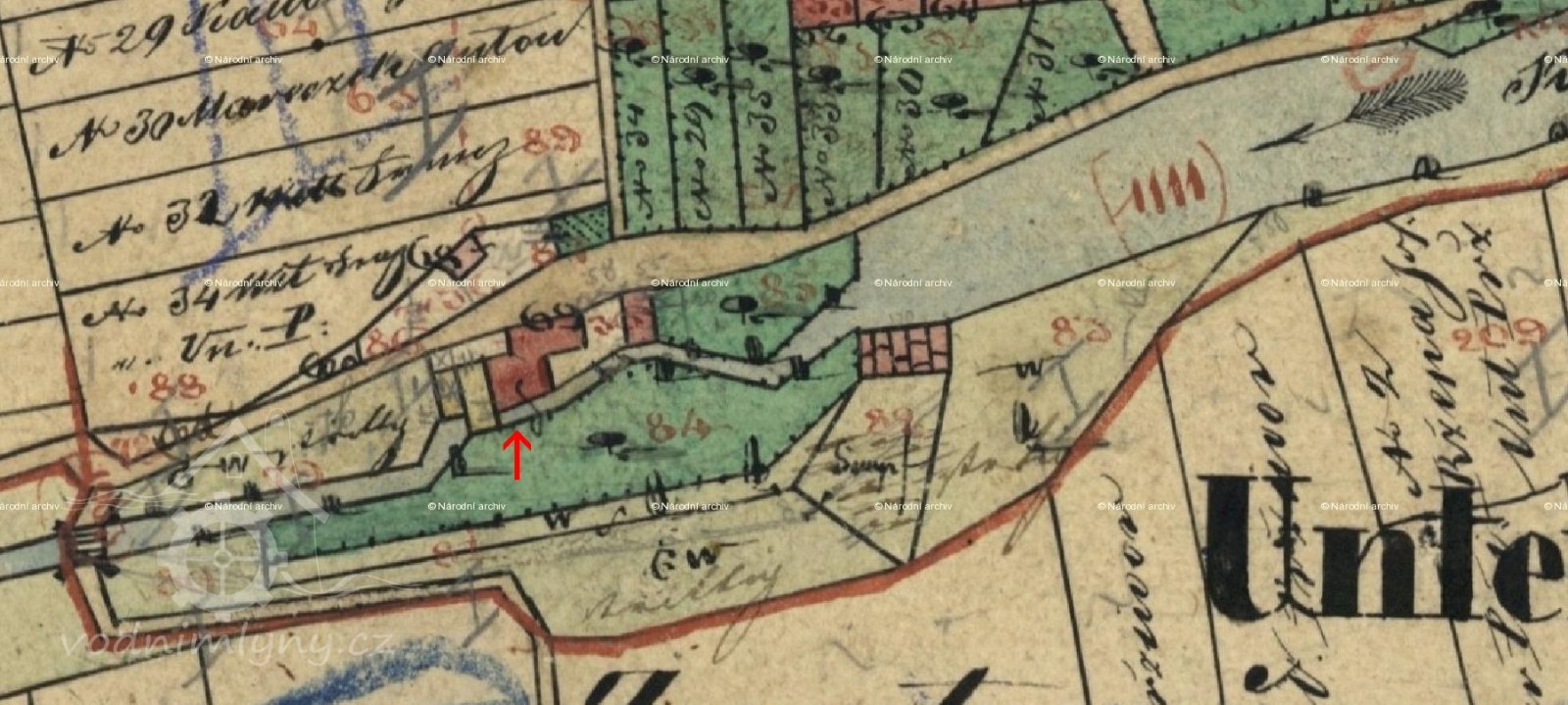 Kameny mlýnské mají v průměru I. kámen 0.85m, II. 0.775m. Od mlýna č. p. 36 teče voda směrem k Tišicům tzv. Červenému mlýnu. Cejch byl postaven na zahradě č. p. 84 ku mlýnu patřící. Cejch je z dubového dřeva 1. 35m dlouhý a 24cm ve čtverci silný. Na hlavě desky jsou vyryté písmena B. S. a r. 1876. Do jámy  2m hluboké byl zapuštěn tento cejch.