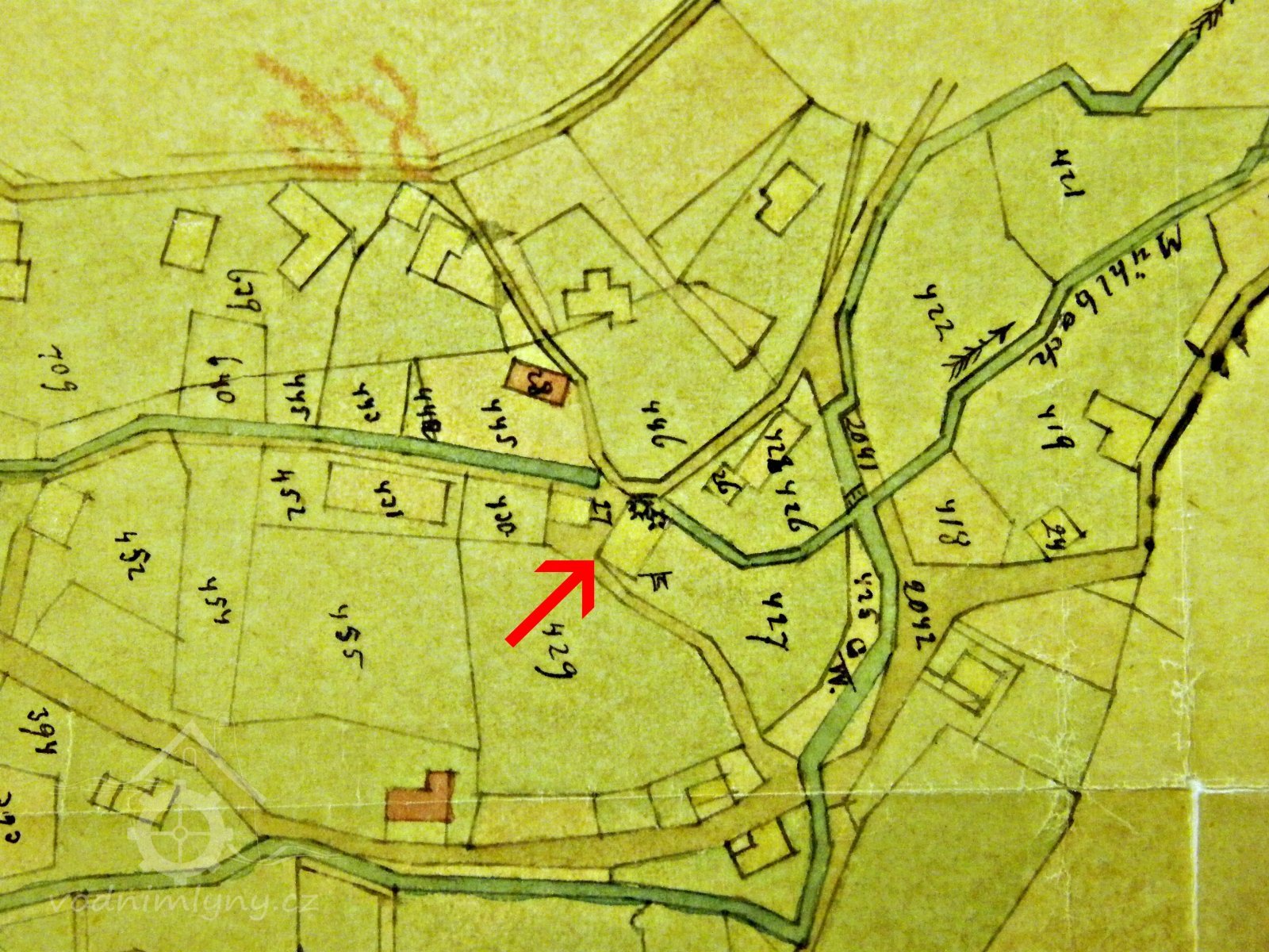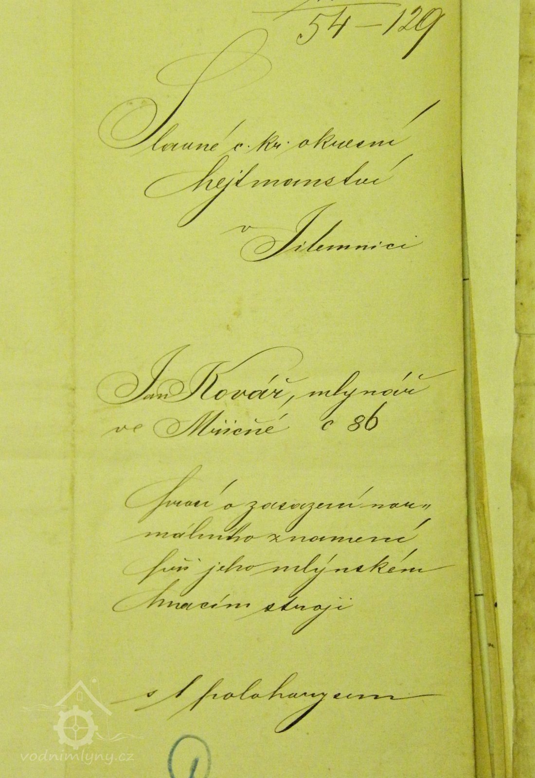 Mlýn se nachází již ve 40tých letech 19. století na mapách stabilního katastru. Roku 1862 mlýn kupuje Jan Kovář v zastoupení otce Pavla z Křížlic. Jednalo se dědické řízení po zemřelém mlynáři z Mříčné, Michalu Plamínkovi. Ještě roku 1877 byl mlýn v držení Jana Kováře. (PŠ)