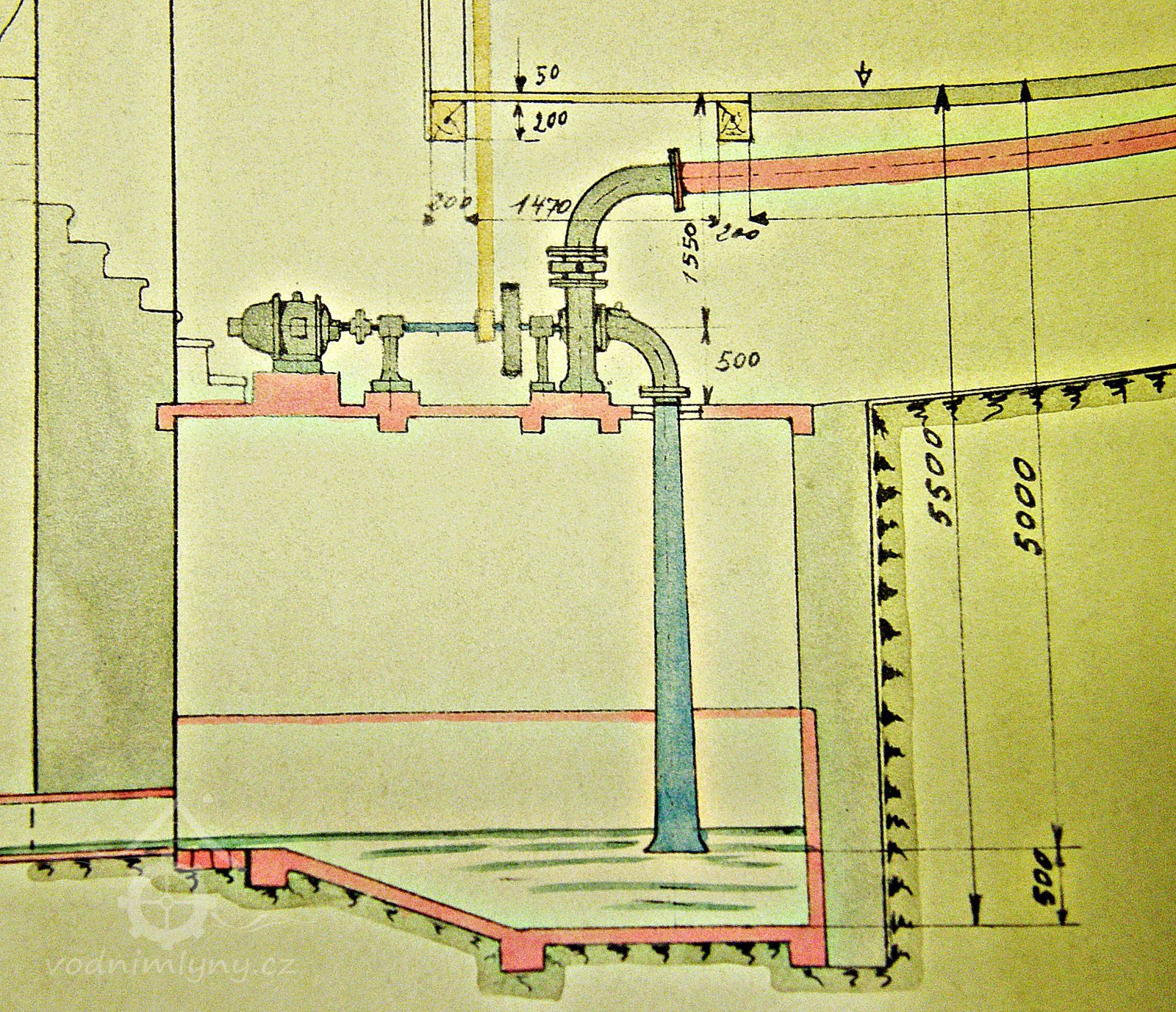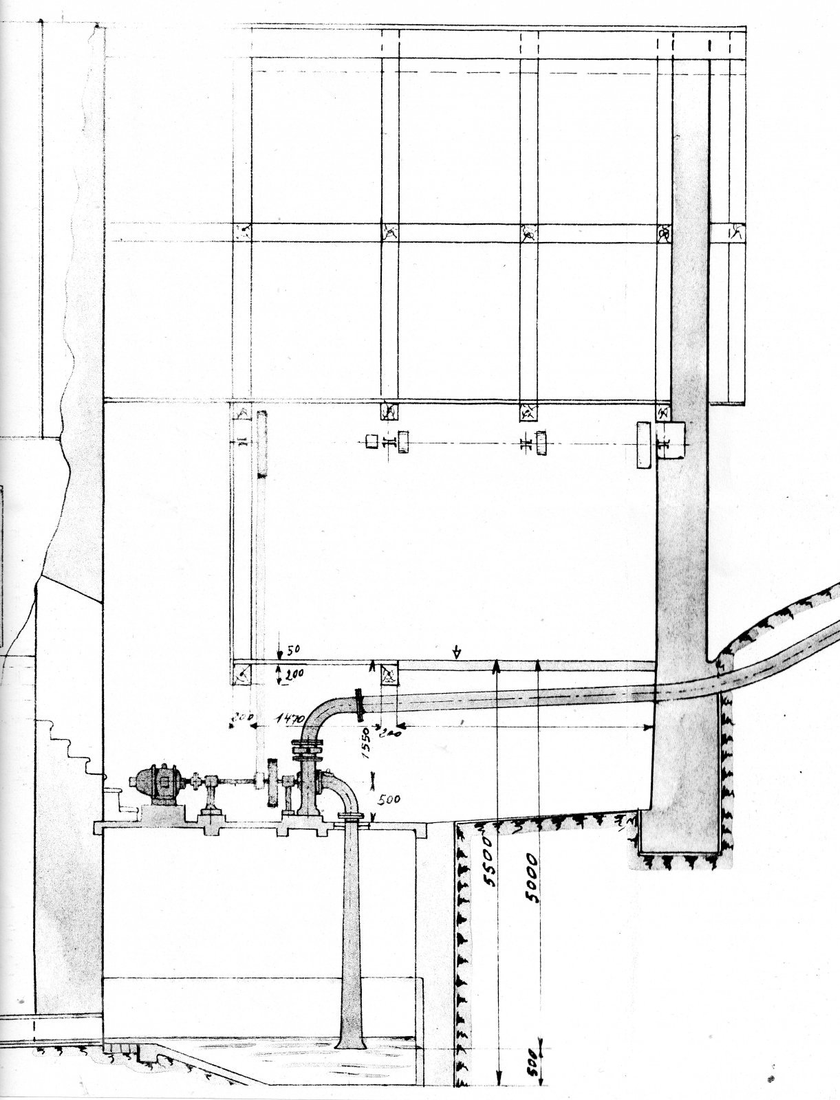 Situace umístění turbíny v objektu, 1934, © Valentin Jaeggle (reprofoto SOkA Semily, Kolssteyn)