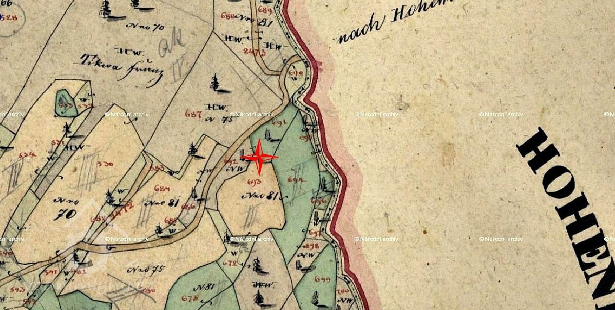 Vyznačení místa budoucího mlýna na indikační skice, 1842, © archivnimapy.cuzk.cz
