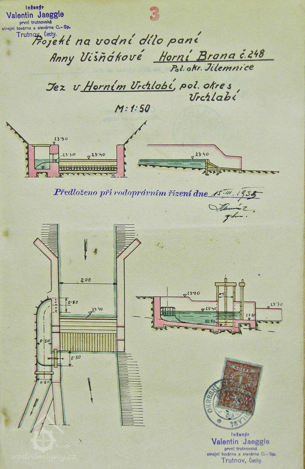 Plán na postavení vodního díla paní Anny Višňákové - Horní Brana č. 248, 20. léta 20. stol., © konstruktér, inženýr, stavitel
