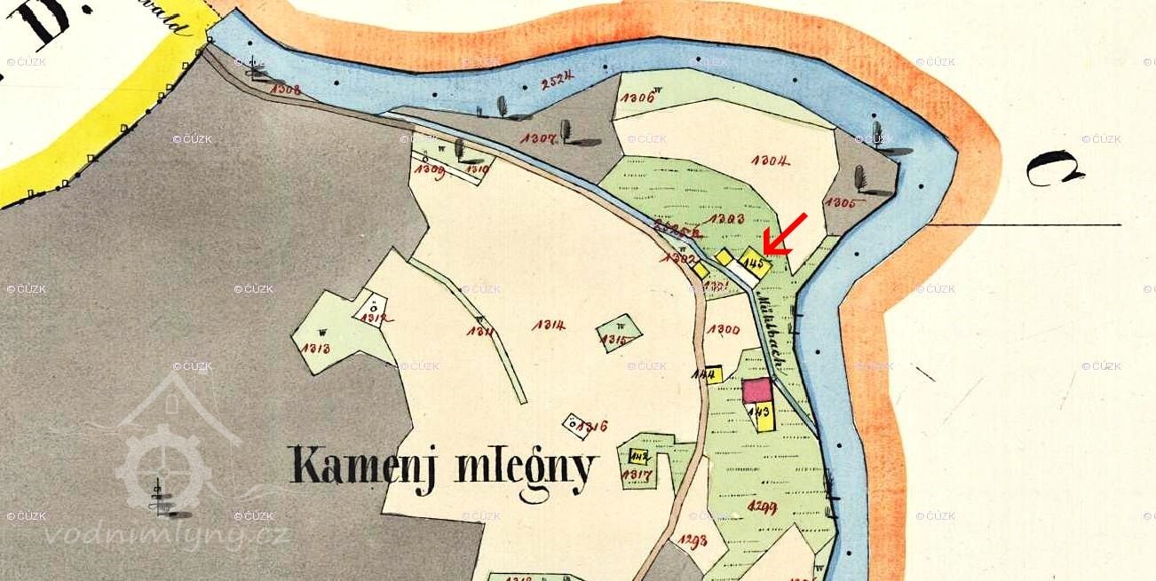 Mlýn byl postaven Janem Grussem (1634-1694), se svolením hraběte Desfourse, roku 1661. (PŠ)