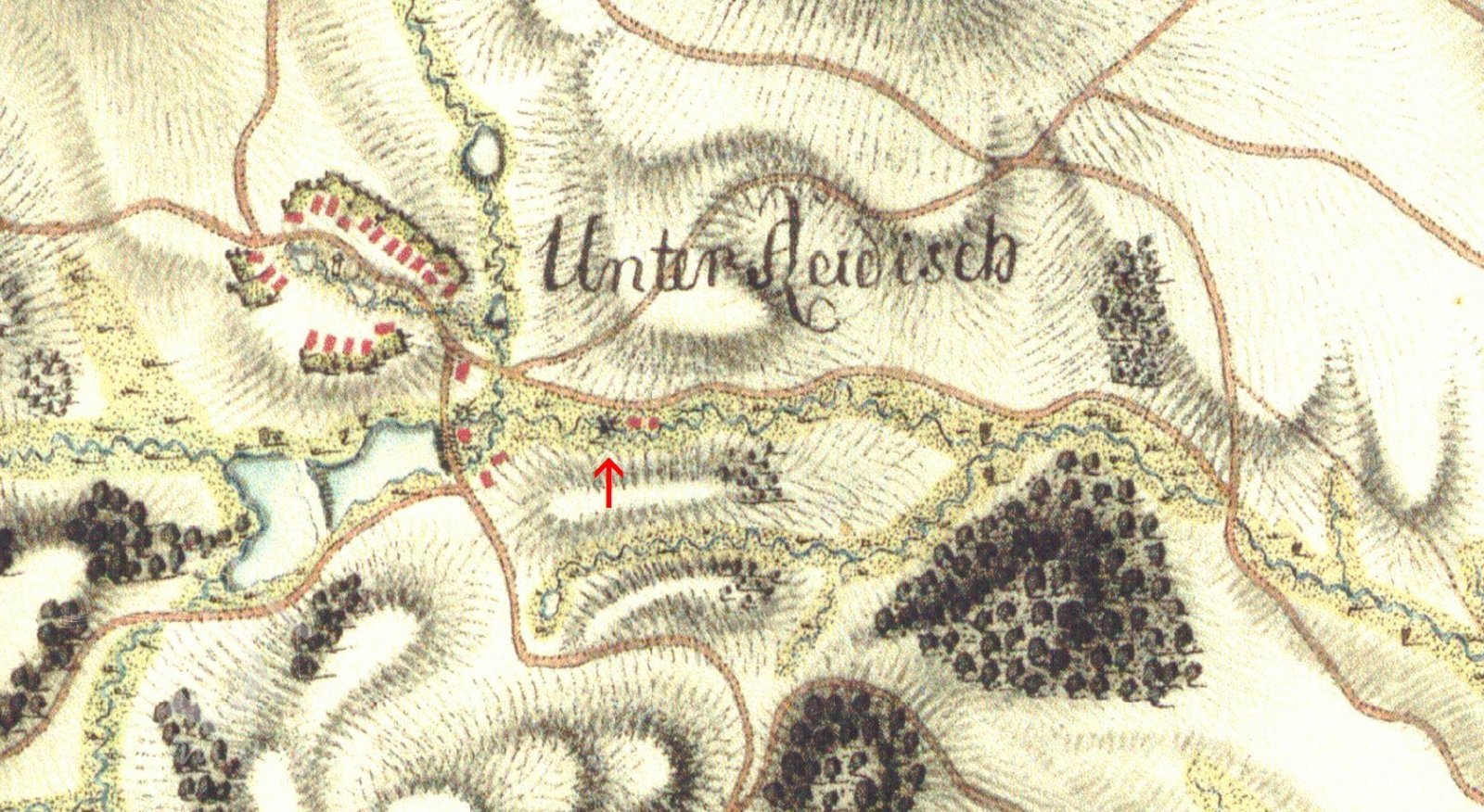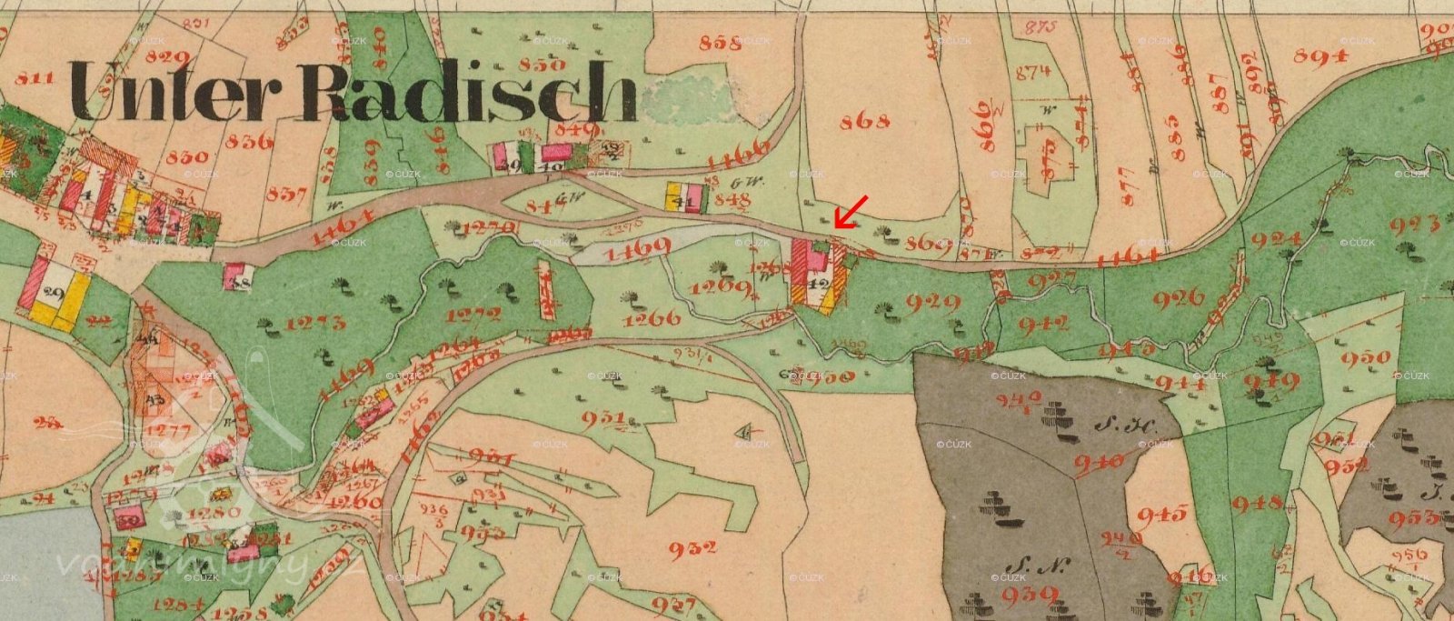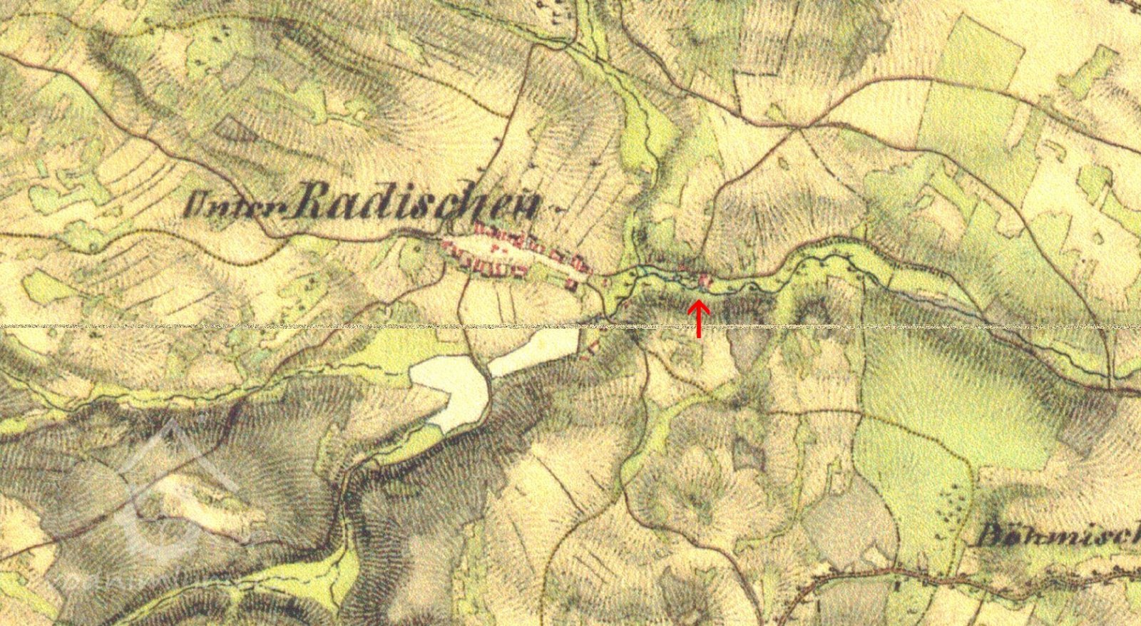 Mlýn s 2 pilami na Radíkovském potoce v blízkosti Dolního Radíkova (n. Unter Radisch) je písemně zaznamenán již kolem roku 1597, kdy rudolecké zboží bylo zvětšeno Václavem Hodickým, který od Viléma z Roupova na Horních Němčicích přikoupil vsi Matějovec se dvorem, Dolní Radíkov s mlýnem a 2 pilami, dvůr Růžennou (Rožnov), Stálkov se dvorem a ovčínem, Vlastkovec a Stoječín s pustými osadami Rapolec, Ejvanč a Petrov za třináct tisíc zlatých moravských.