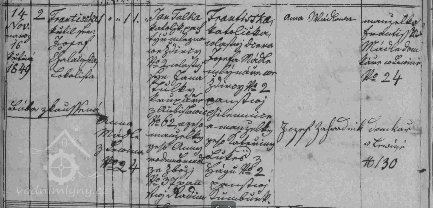 1845 si vzal Jan Tulka, pachtýř tohoto mlýna, Františku, dceru Jos. Mádle