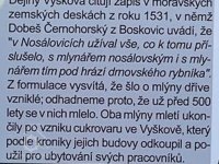 • Moravské zemské desky obsahují zápis z roku 1536 o tom, že v roce 1531 Dobeš Černhorský z Boskovic (prodávající) prodává svůj nemovitý majetek jehož součástí je i tento mlýn kupujícímu Stanislav Thurzo.