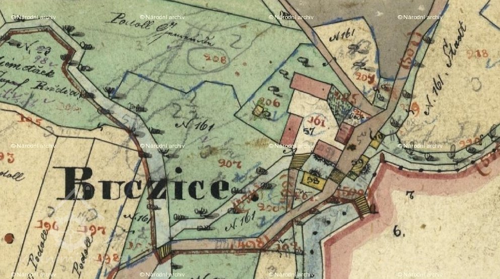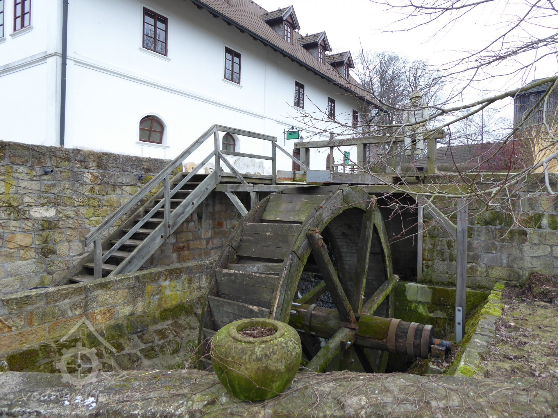 Vodní mlýn při severním konci hráze Bučického rybníka postaven 1639 jako panský (součást panství Rožďalovice).