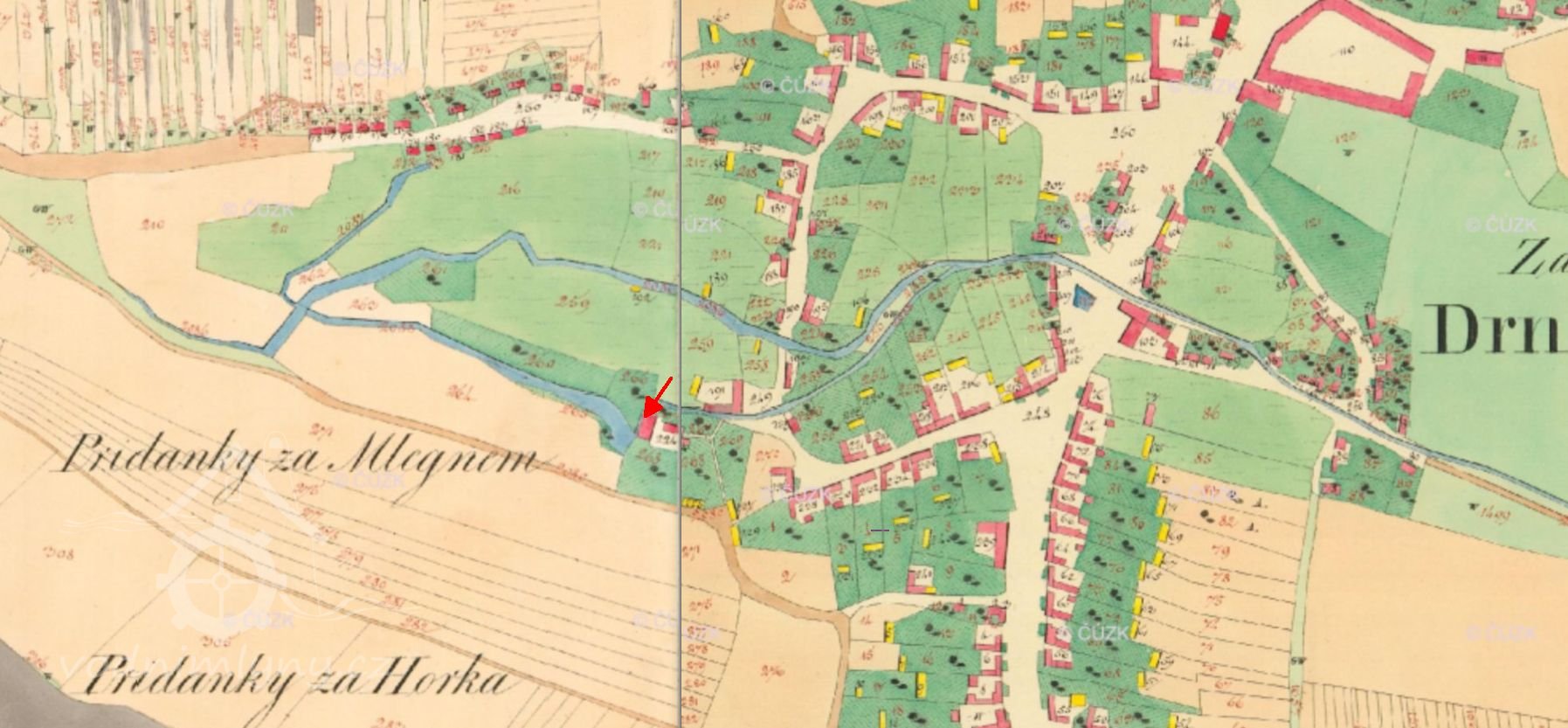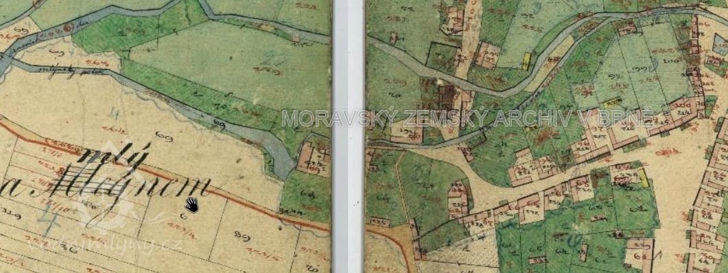 Mlýnský náhon se dá vystopovat pomocí katastrální mapy. Mlýn byl poháněn kolem.